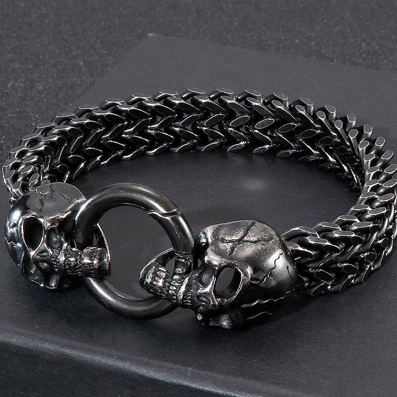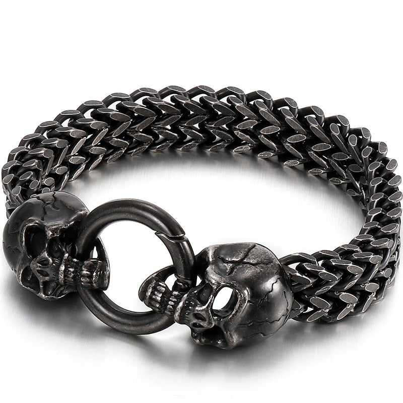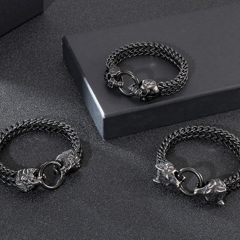 Pulseras para hombre de acero inoxidable negro macizo con calavera gótica, león y cabeza de lobo
