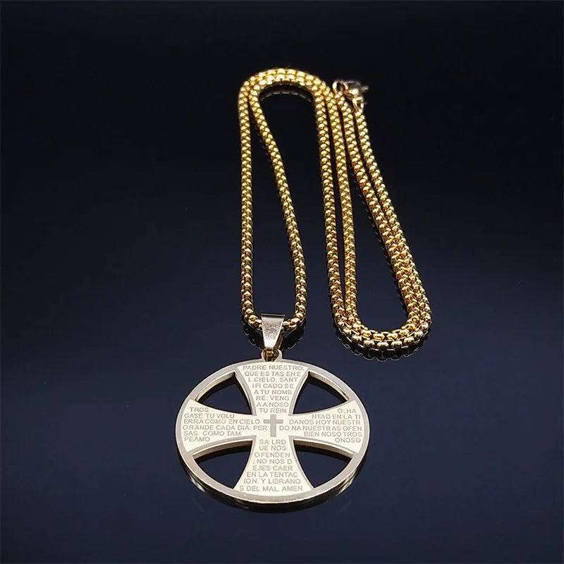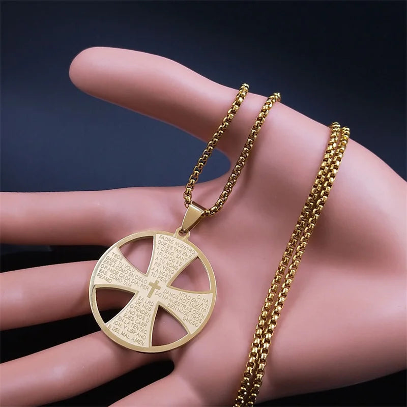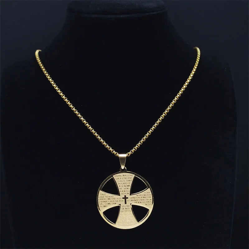 Collar con colgante de cruz de acero inoxidable con versículo bíblico del Padrenuestro en español, collares católicos
