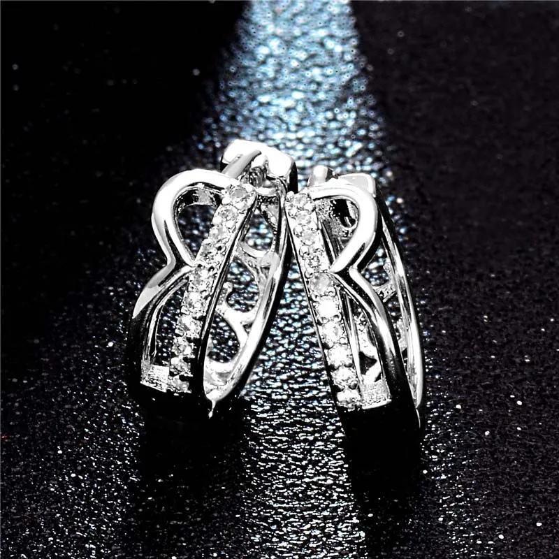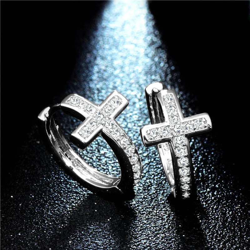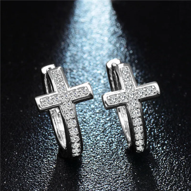 Pendientes de aro con circonita cúbica de alta calidad y diseño geométrico especial de cruz plateada para mujer.