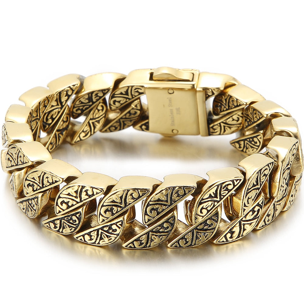 Pulsera de acero inoxidable de 17 mm de ancho para hombre, con correa de metal chapada en oro, de 7,9"