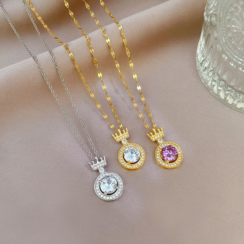 Collares de acero inoxidable con colgante clásico de corona de circonita cúbica, cadena tipo gargantilla