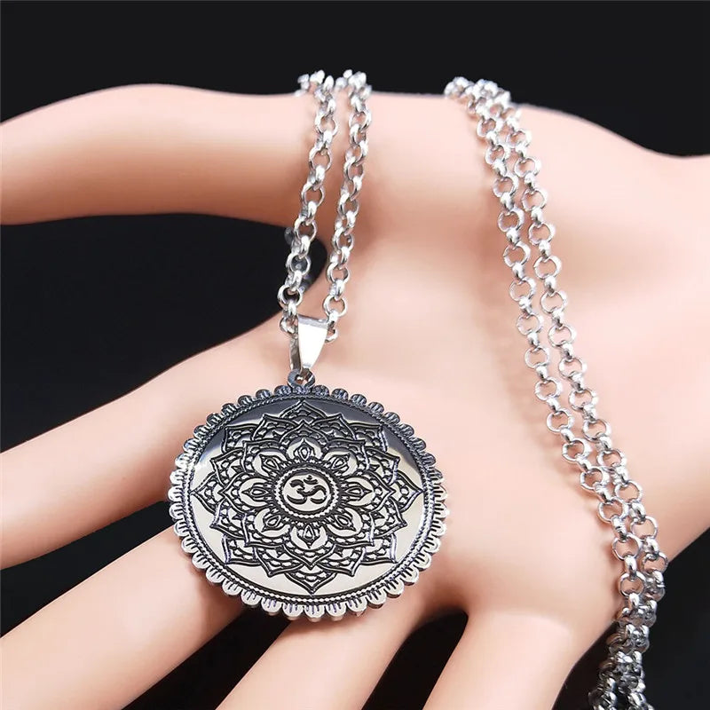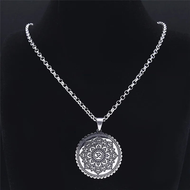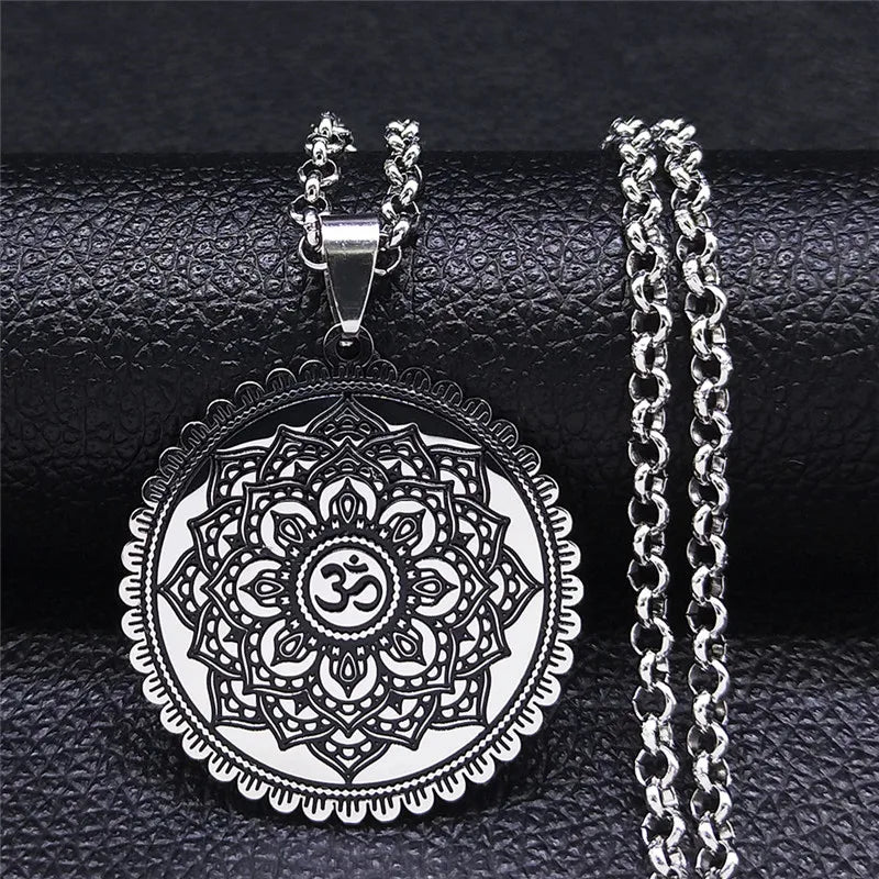 Collar de cadena de acero inoxidable con símbolo OM de la Flor de Loto de la Vida para yoga, hindú y budista.