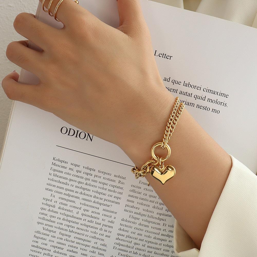Pulsera con colgante de corazón de acero inoxidable en color dorado, joyería de oro 585, accesorio de pulsera con textura de metal a la moda.