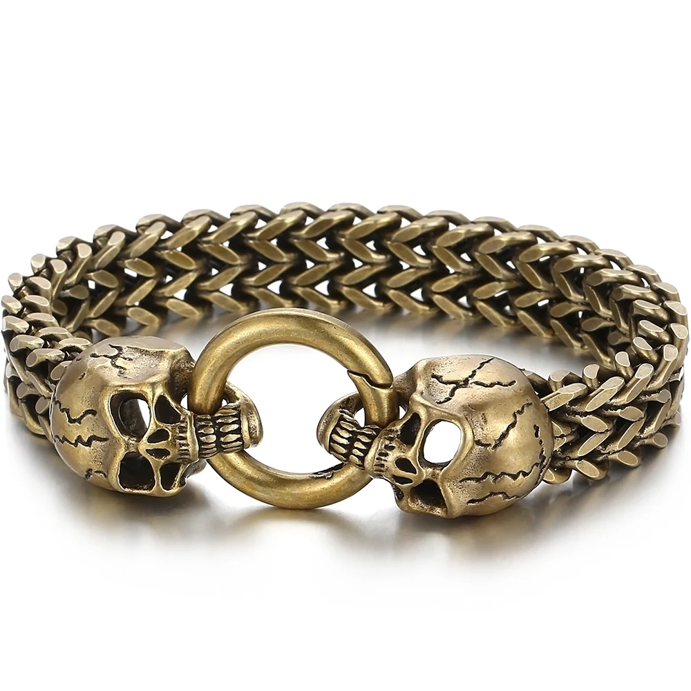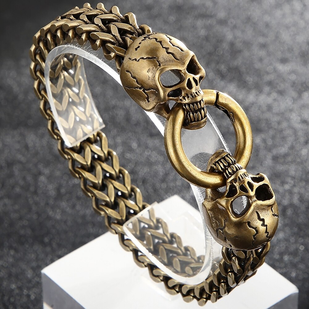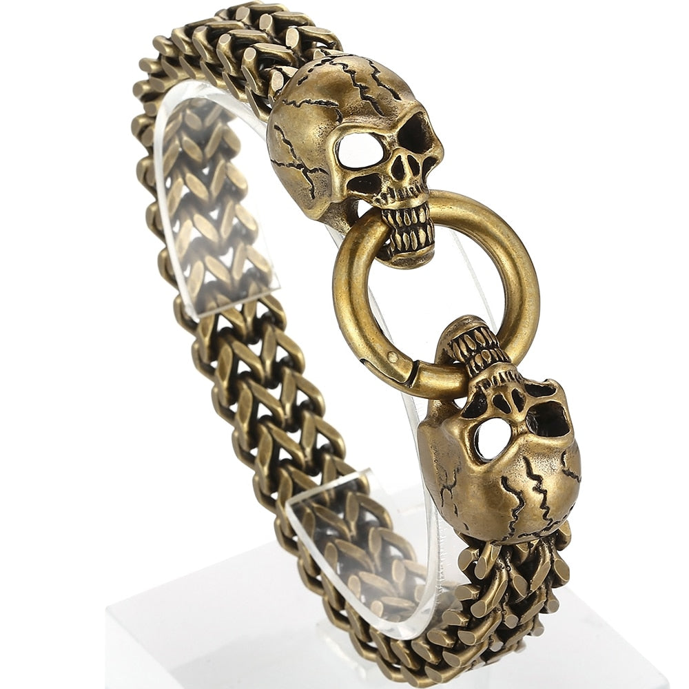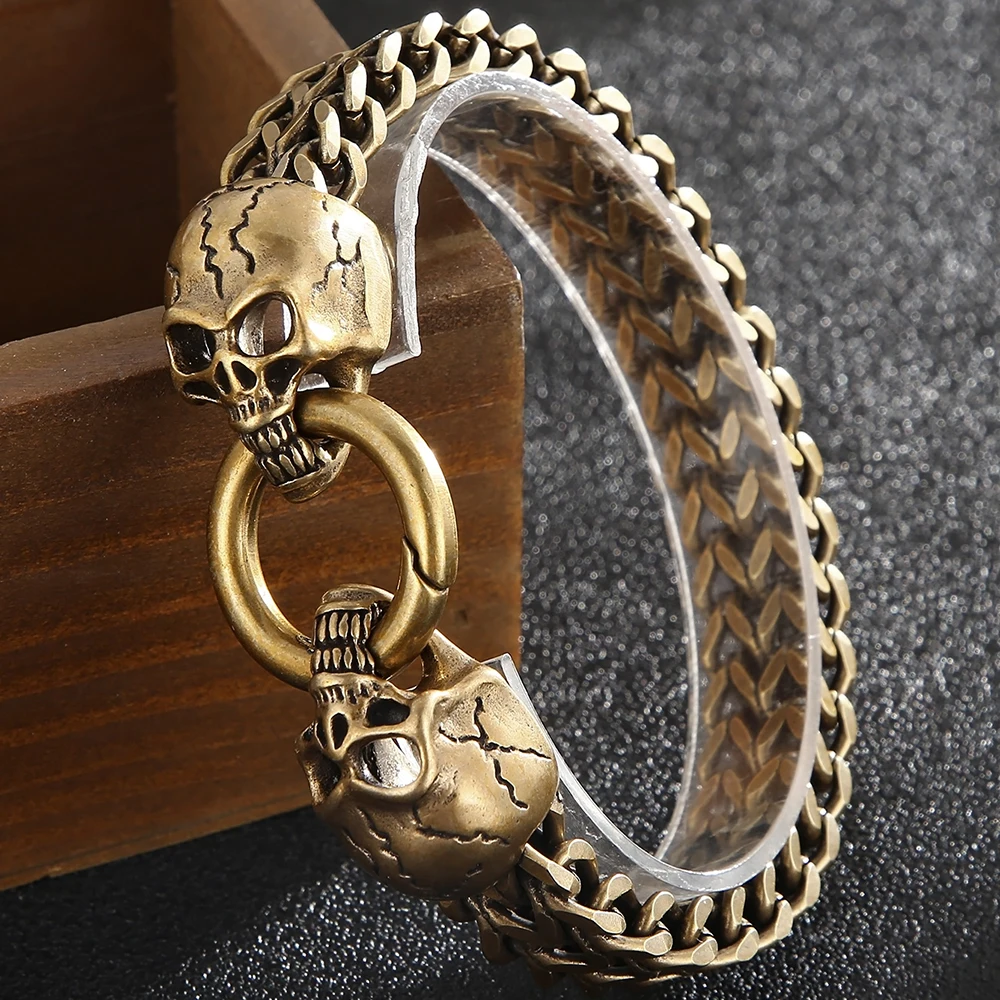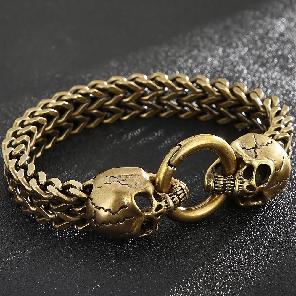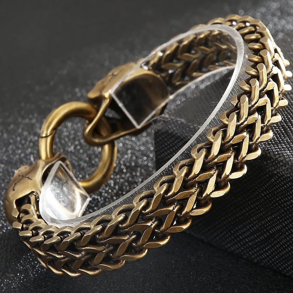 Pulsera Steampunk con doble calavera en la mano para hombre, de acero inoxidable, color dorado, estilo vintage, joyería de motociclista, regalo.