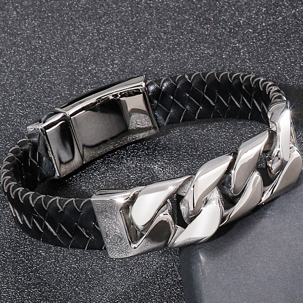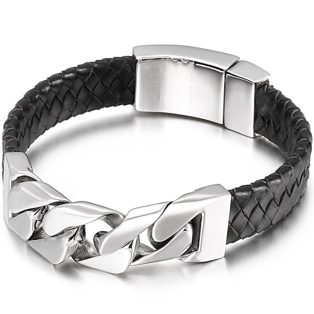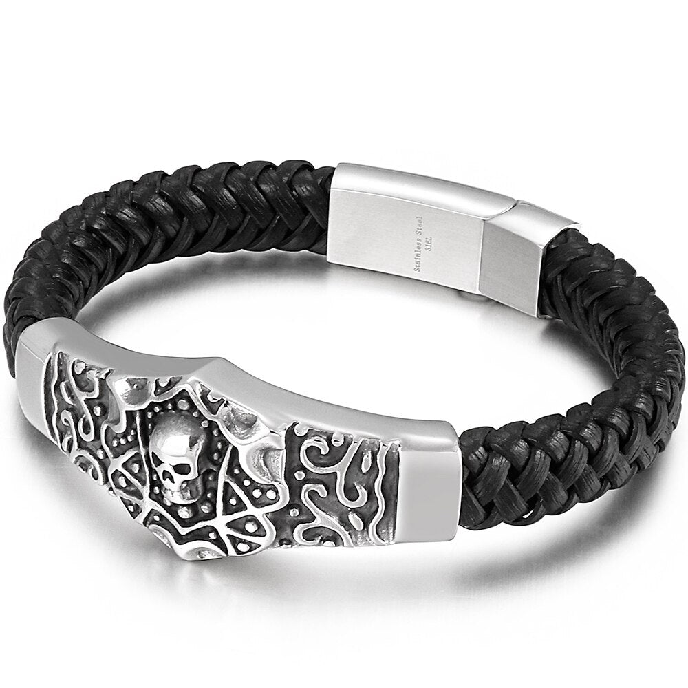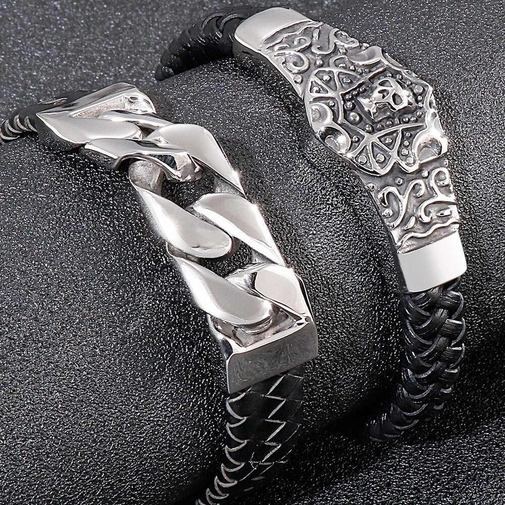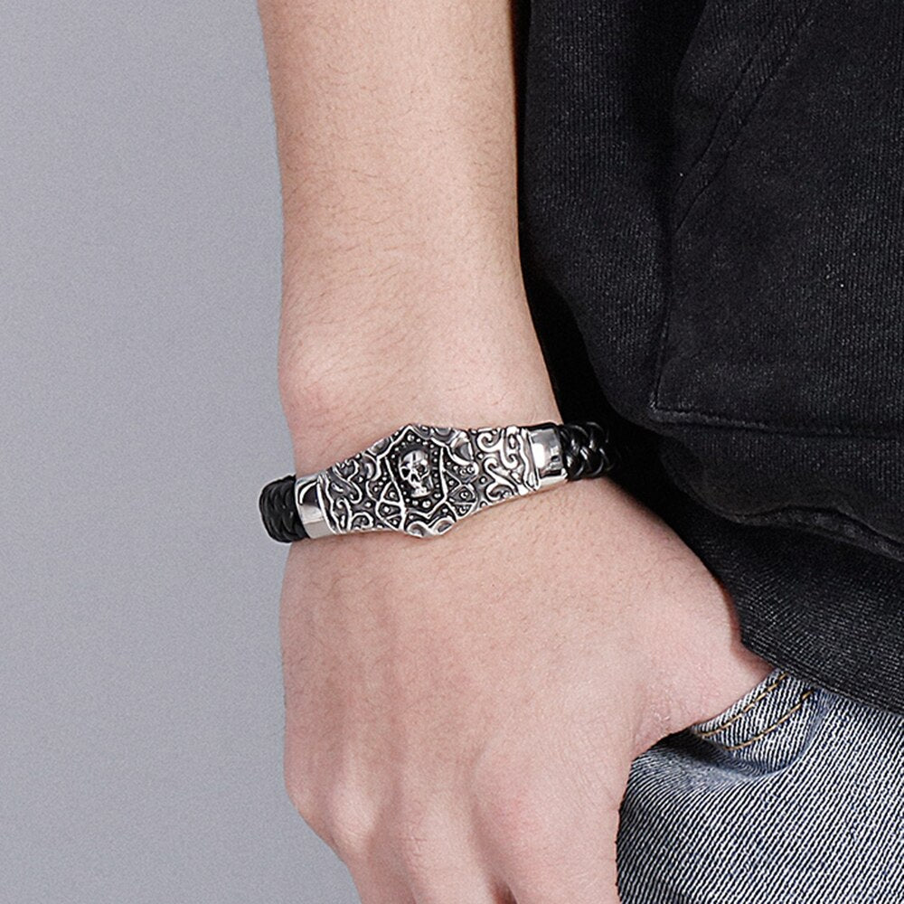 Pulsera de calavera steampunk para hombre, de cuero trenzado, de acero inoxidable, con cadena de eslabones, pulseras con dijes para hombre, joyería masculina