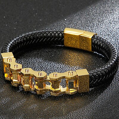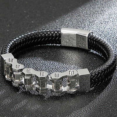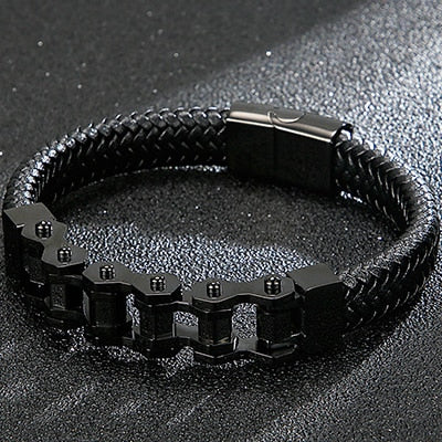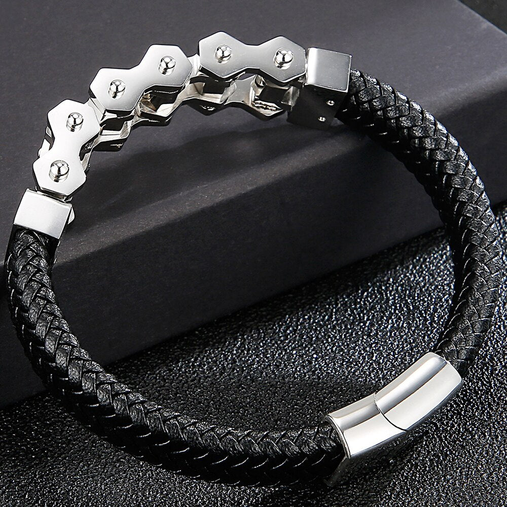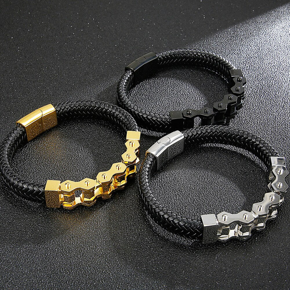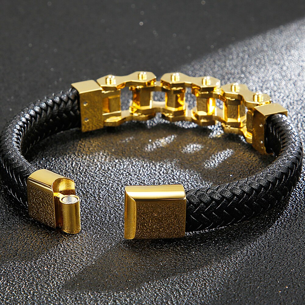 Pulsera de cadena de motociclista de acero para hombre, brazalete de cuero trenzado con cierre magnético