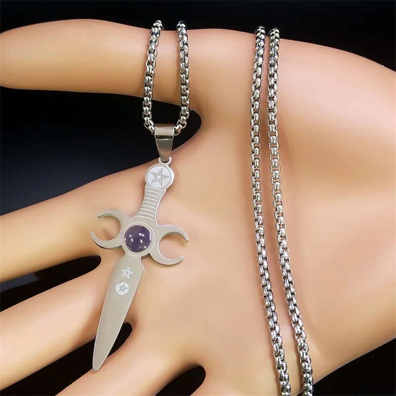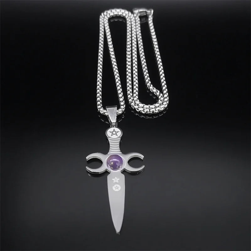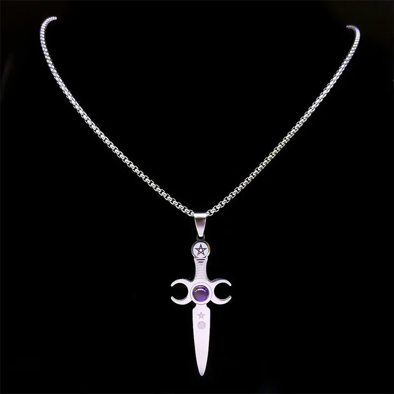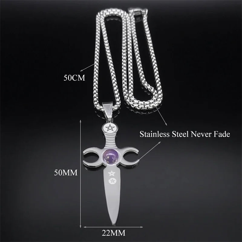 Collar con pentagrama de la diosa de la luna triple y espada, acero inoxidable, cristal morado, cadena pagana de bruja