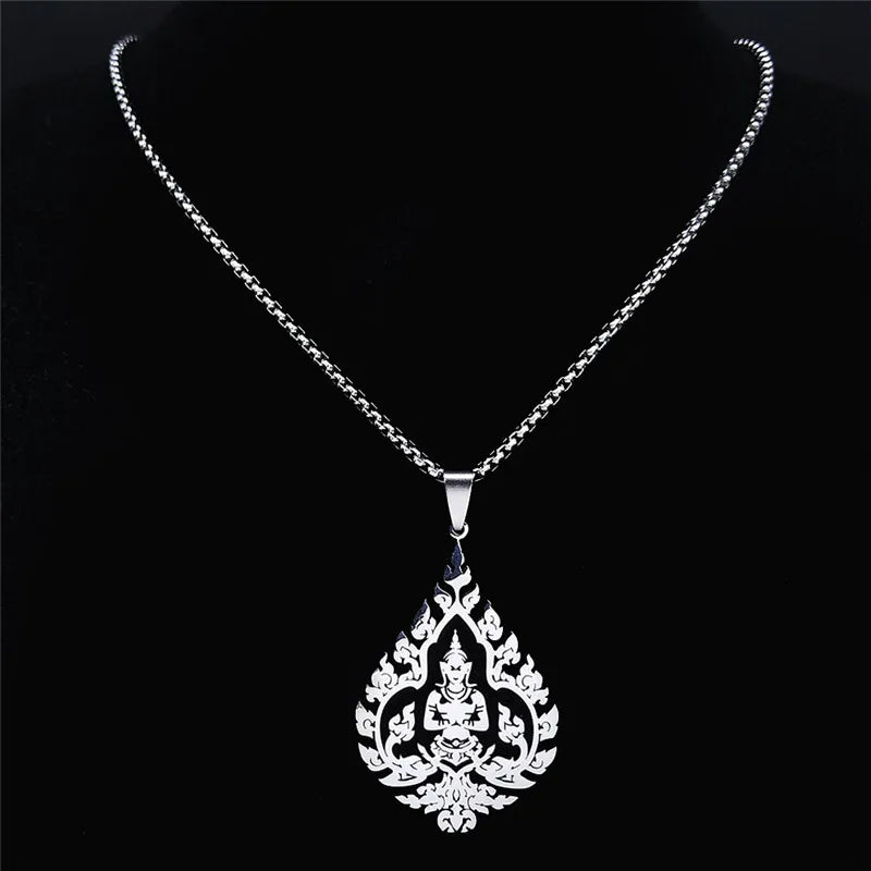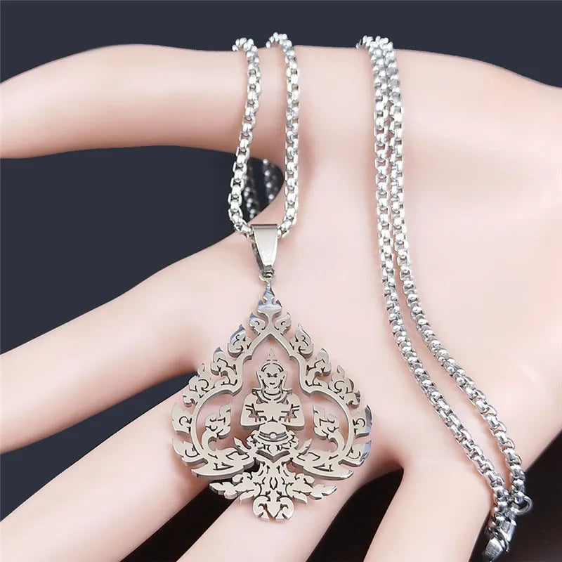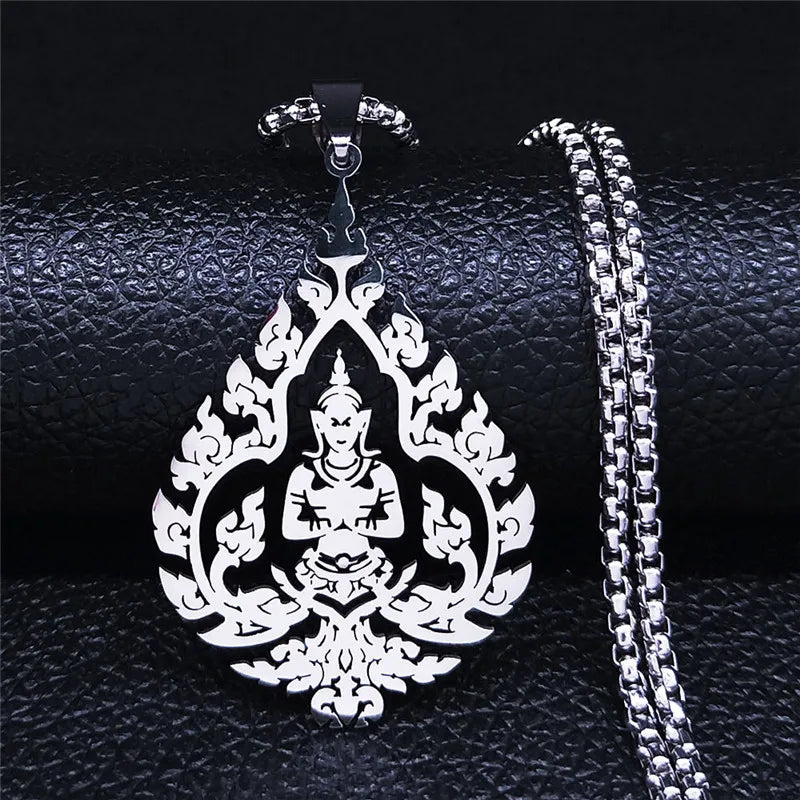 Collar de acero inoxidable con diseño de bodhisattva tailandés para mujer, color plateado, cadena religiosa