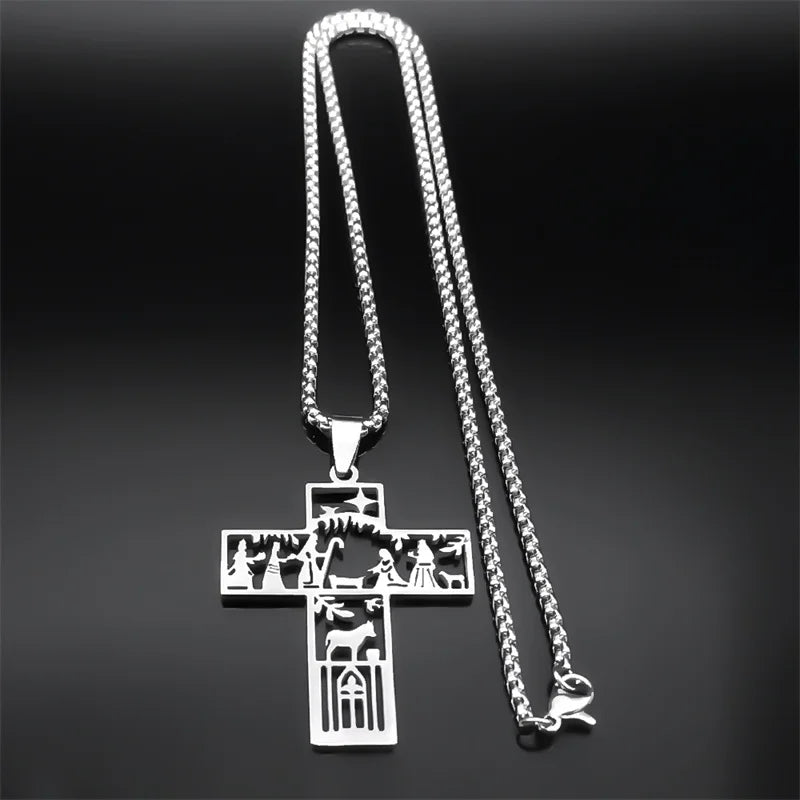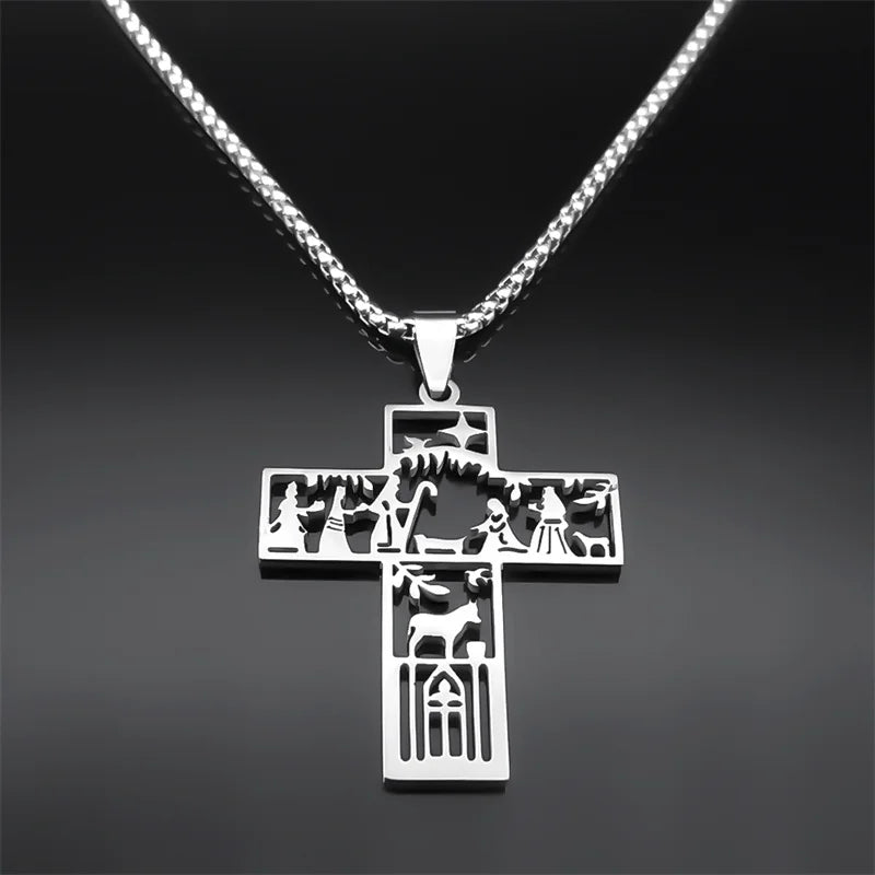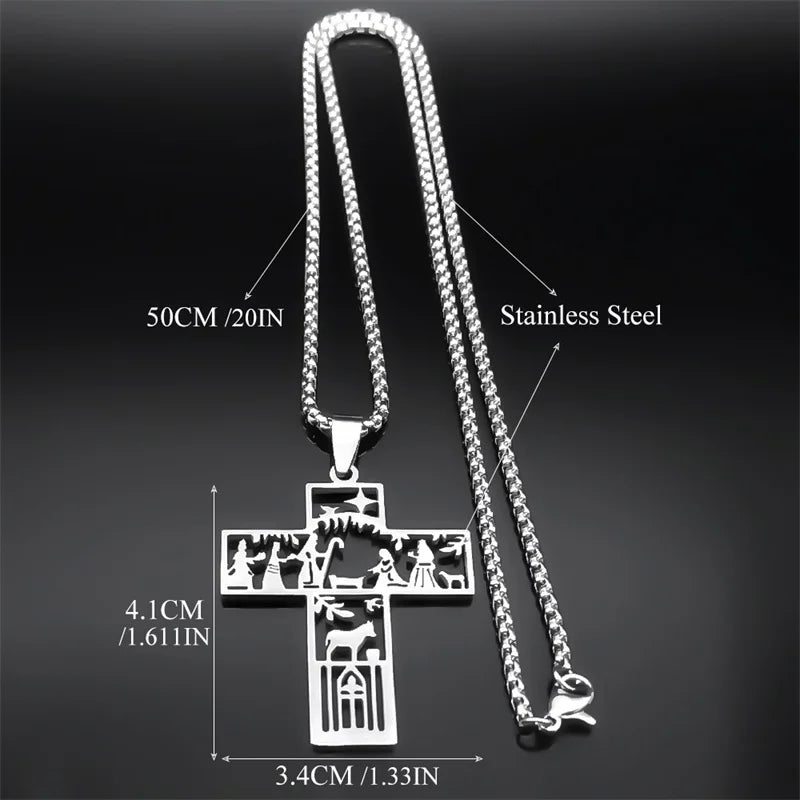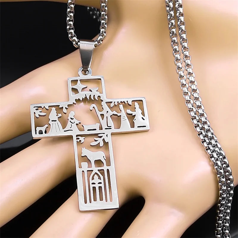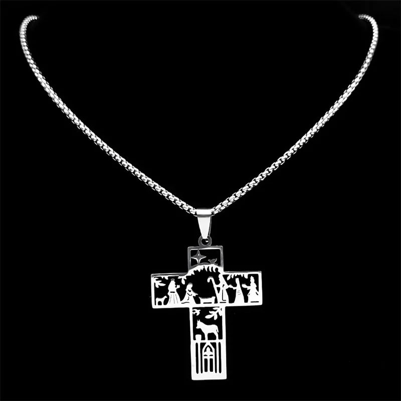 Collar con cruz del bautismo de Cristo para mujer y hombre, de acero inoxidable, color plata, amuleto cristiano, cadena de estrella, joyería