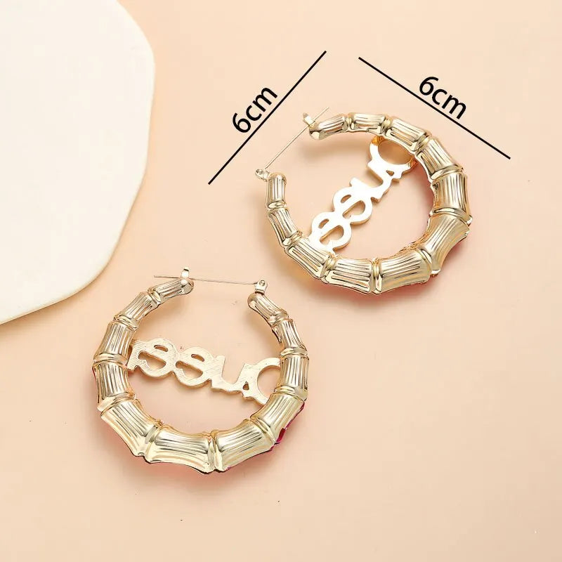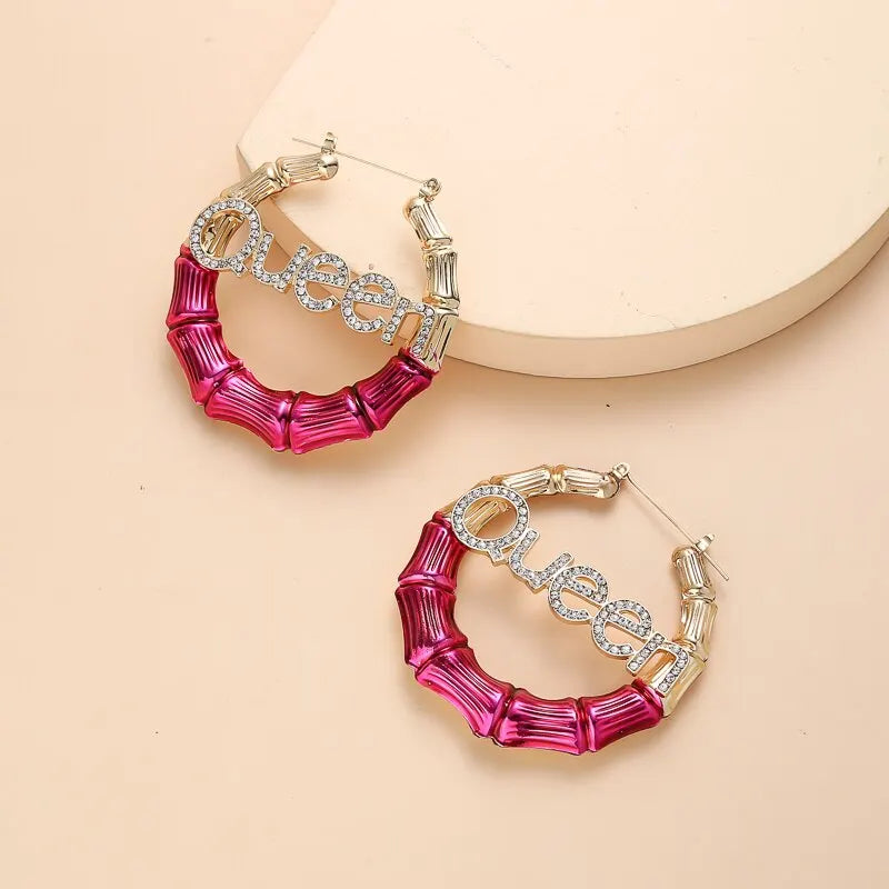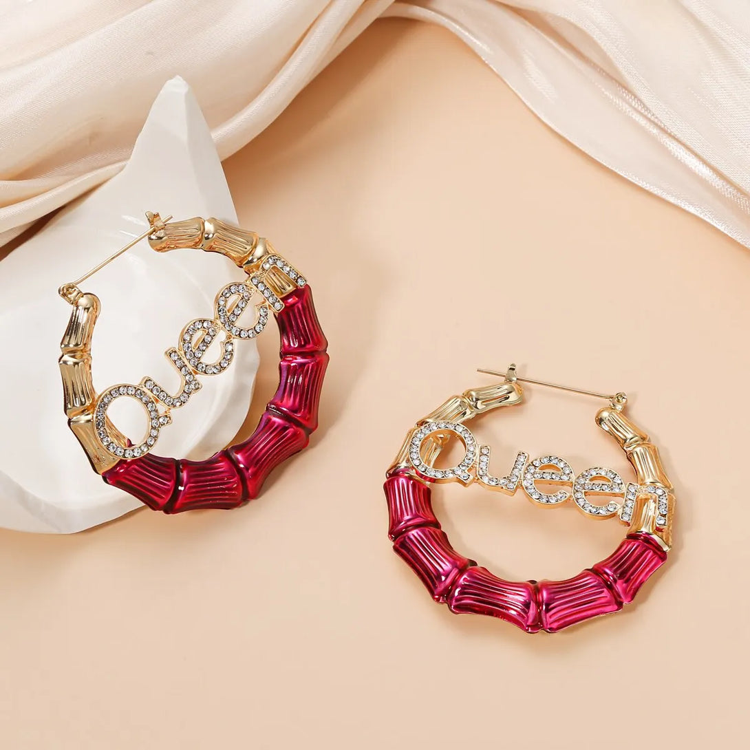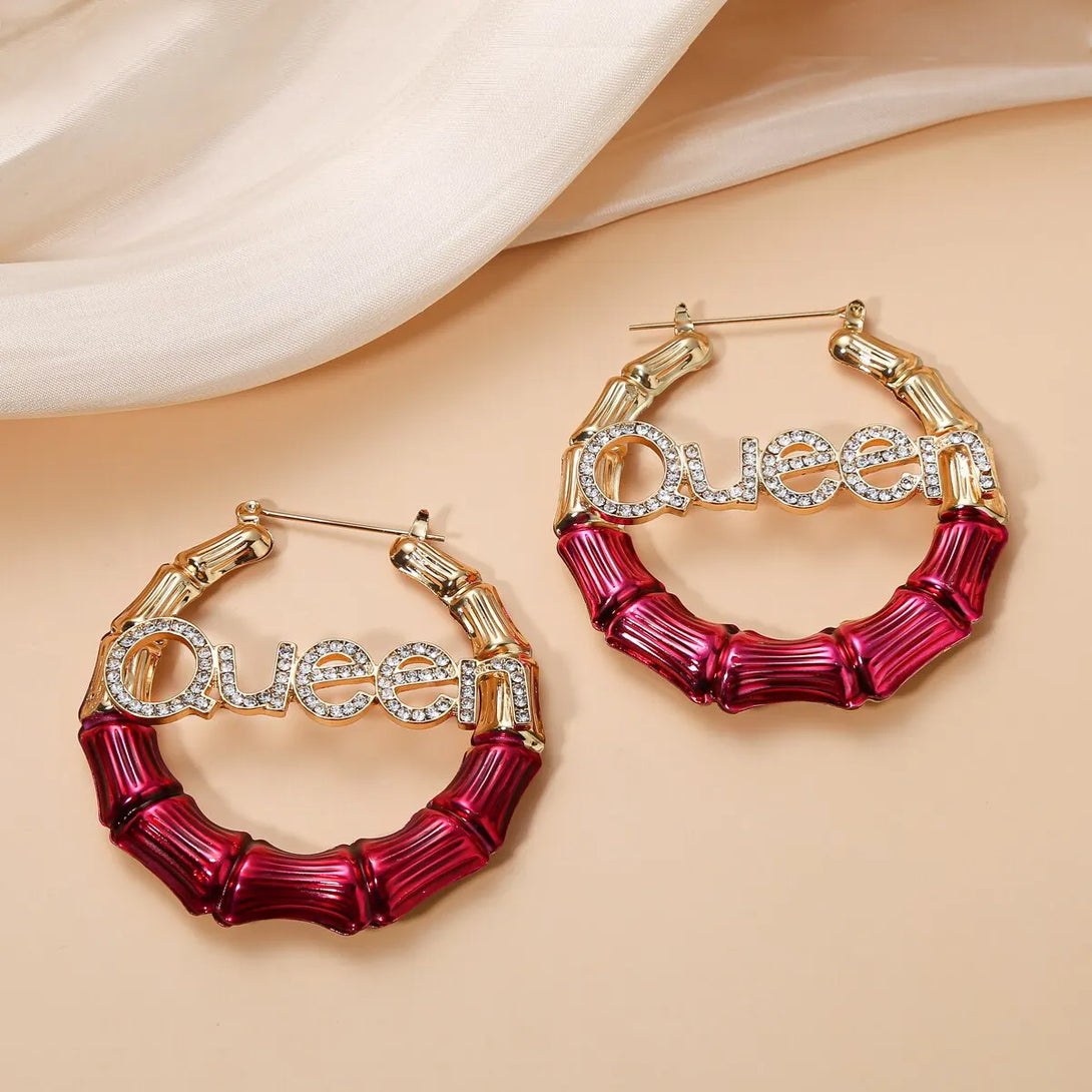 Pendientes de aro de bambú con forma de círculo grande y moderno para mujer, aretes llamativos de metal con letras de la reina dorada, joyería punk