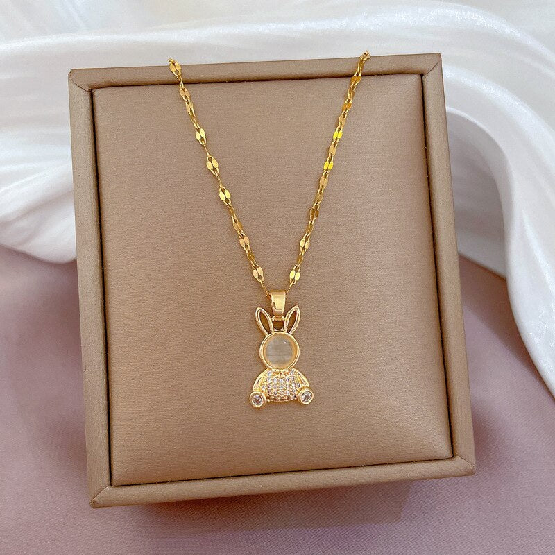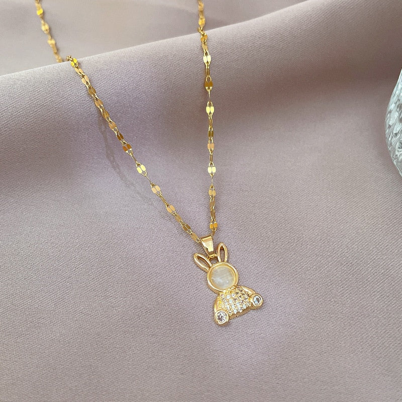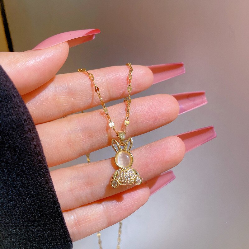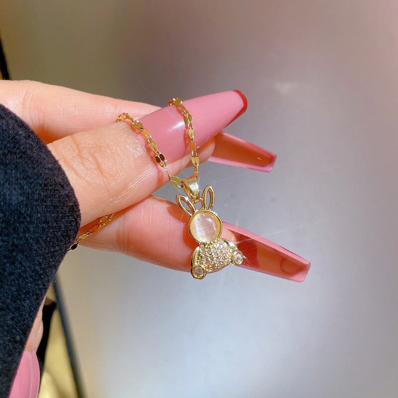 Collar con colgante de conejo bonito y moderno con cadena de ópalo brillante para mujer
