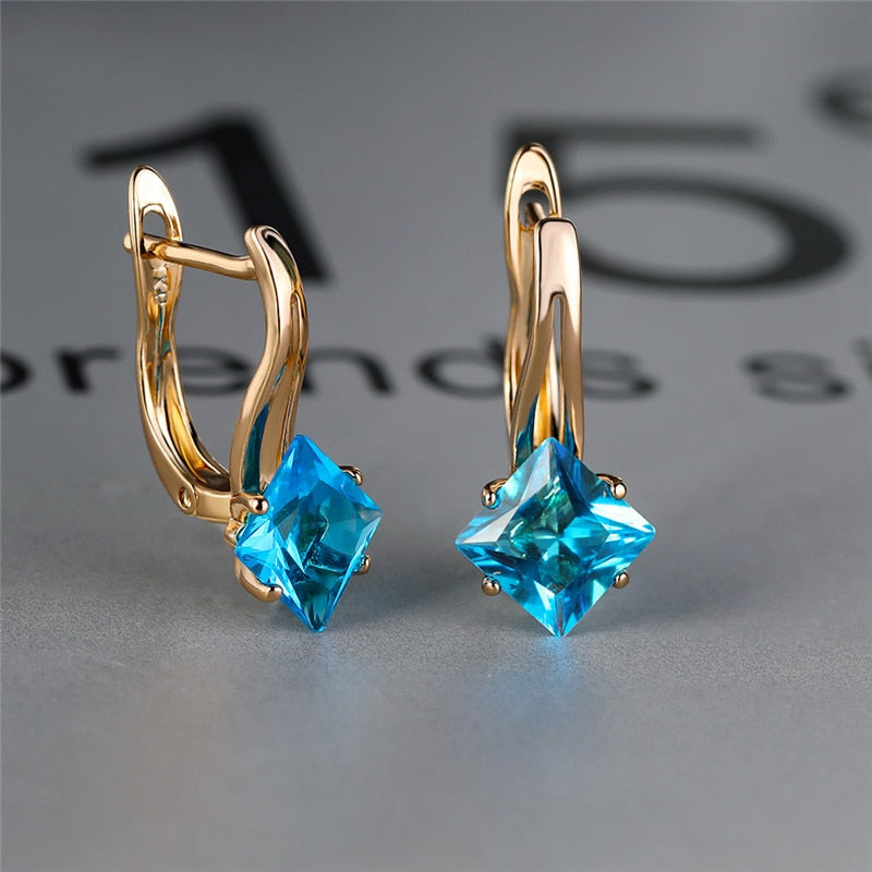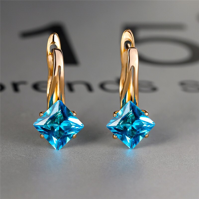 Pendientes de moda: modernos pendientes de circonita azul aguamarina para mujer, con clip en oro rosa, delicados pendientes de boda cuadrados de cristal.