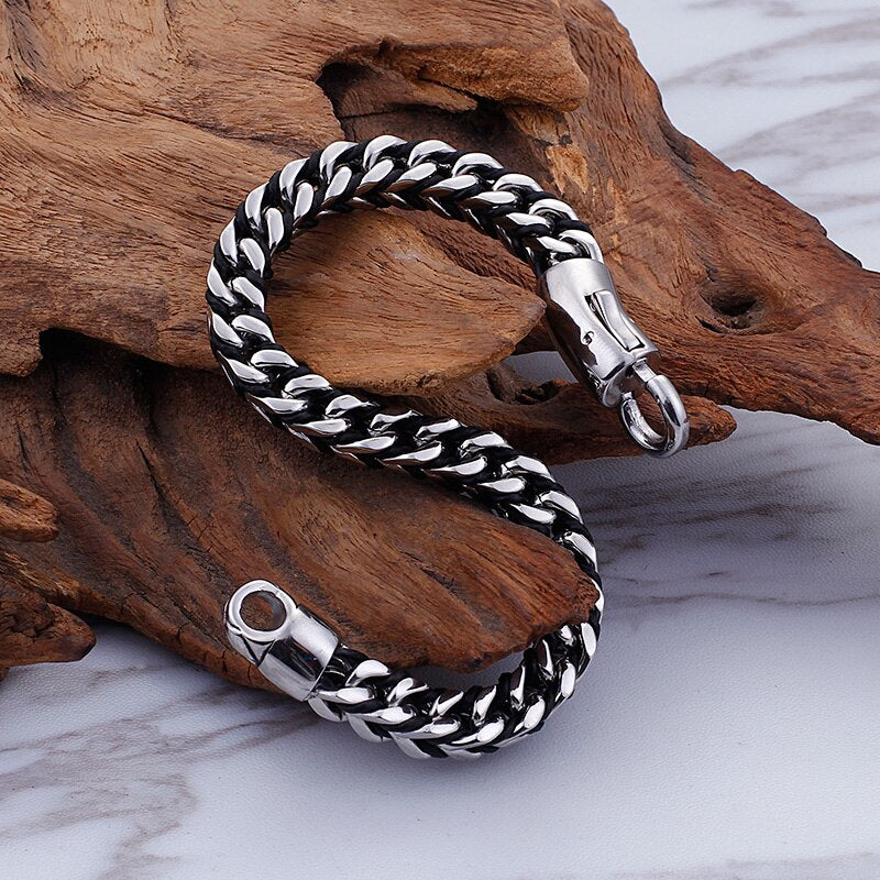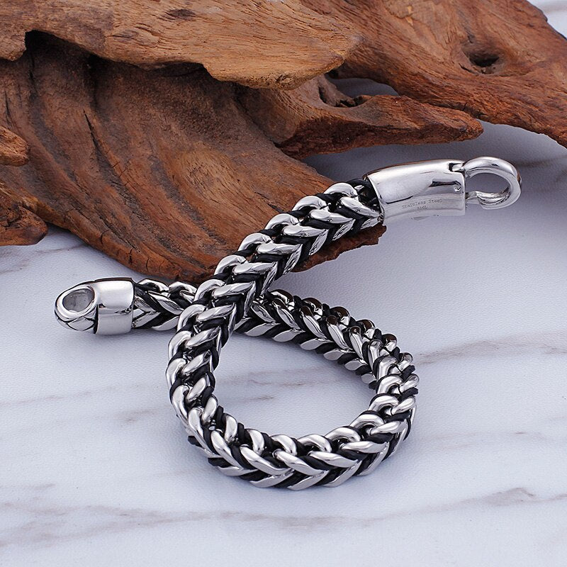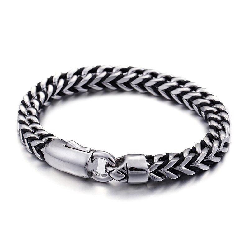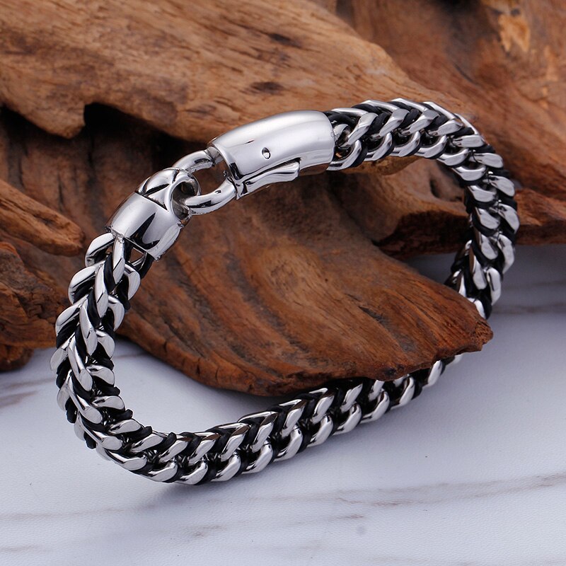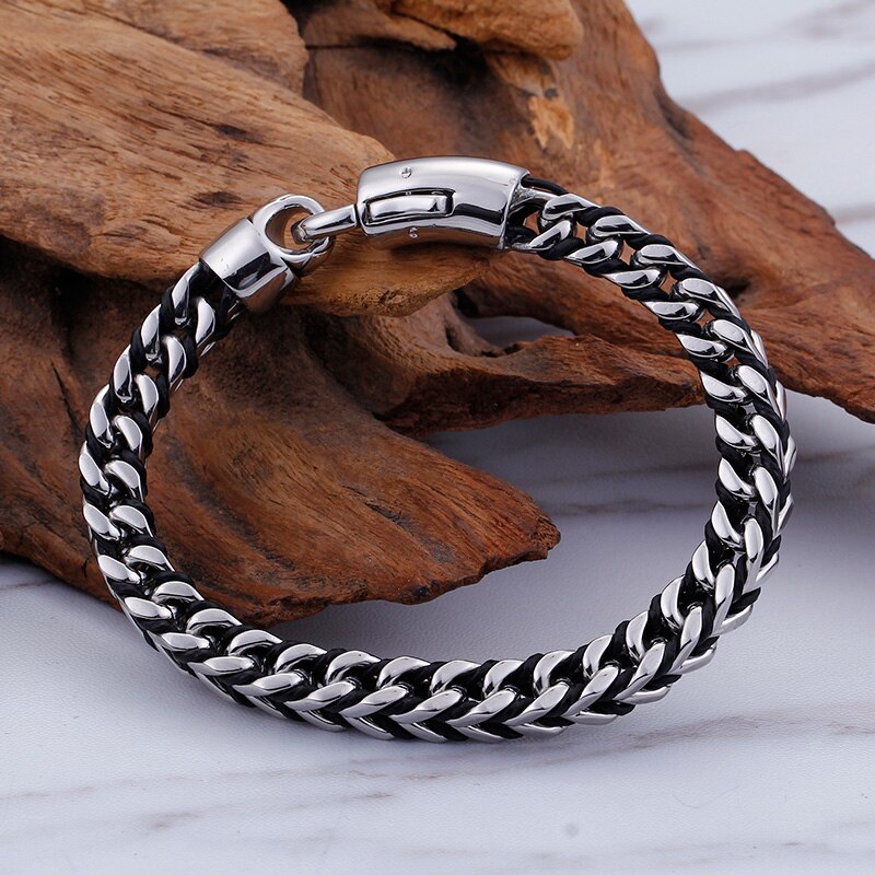 Pulsera de acero inoxidable brillante y moderna para hombre, de 8 mm de ancho, con correa de cuero.