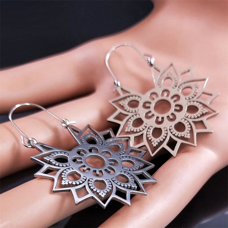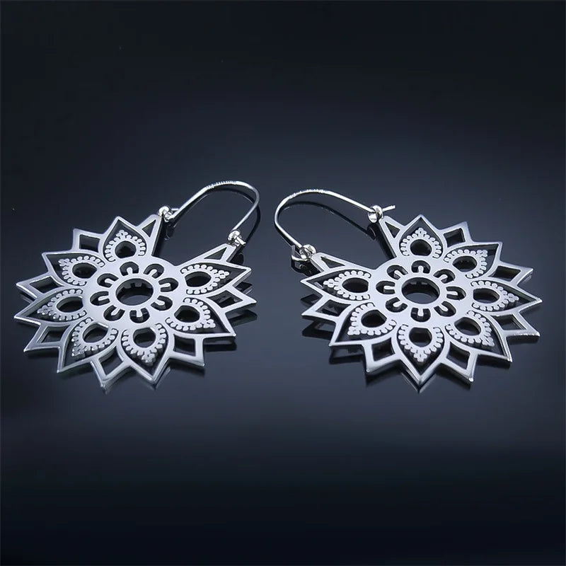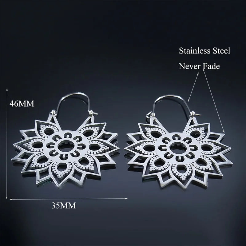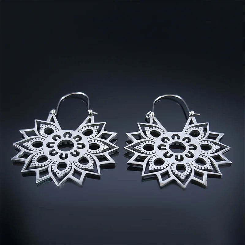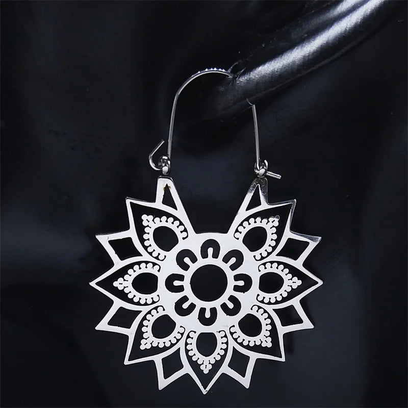Pendientes tribales de flor de loto, de acero inoxidable, color plata, con diseño de mandala, joyería de aro, aretes de aro de acero inoxidable