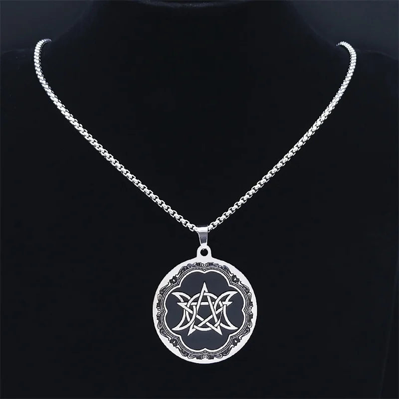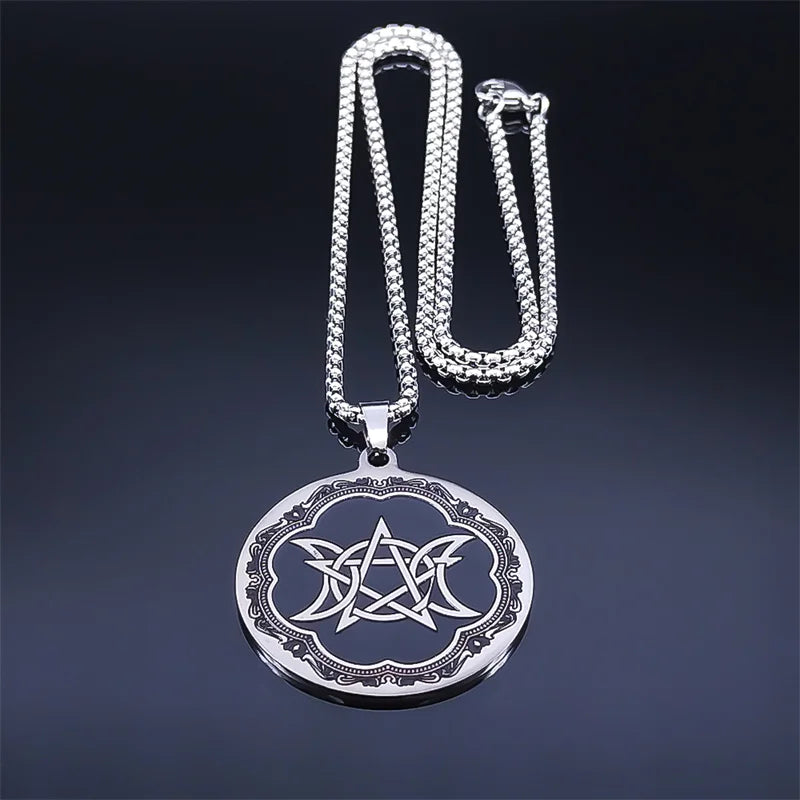 Collar con colgante de pentagramas de triple luna, acero inoxidable, para adivinación y astrología.