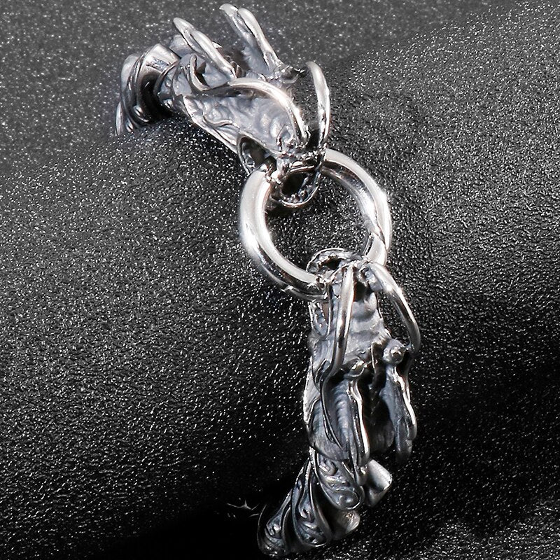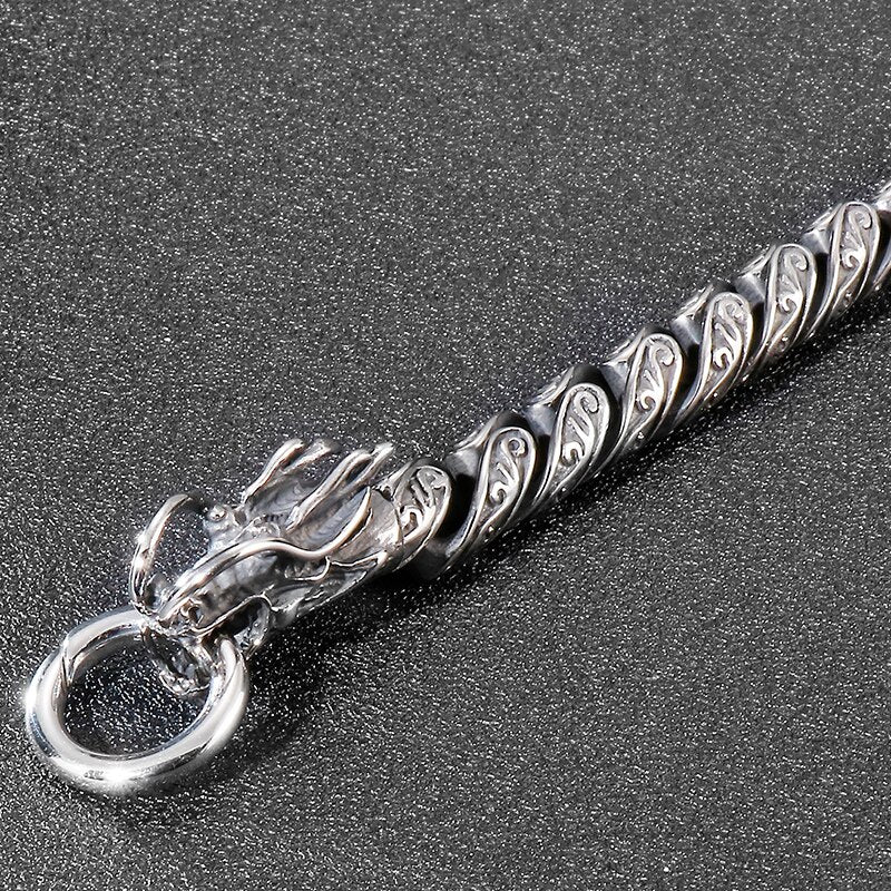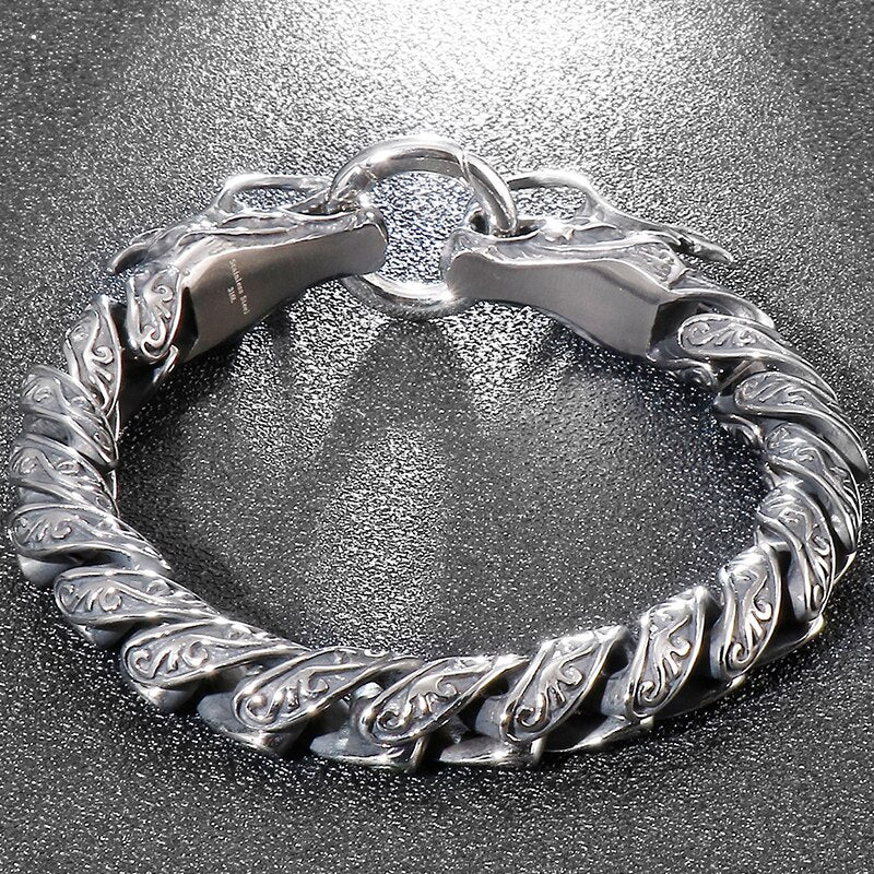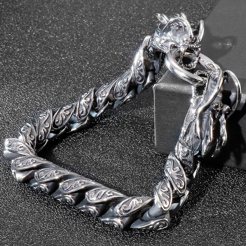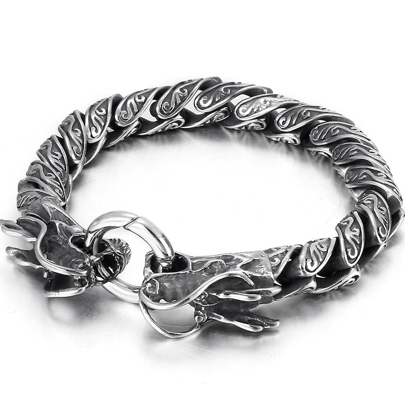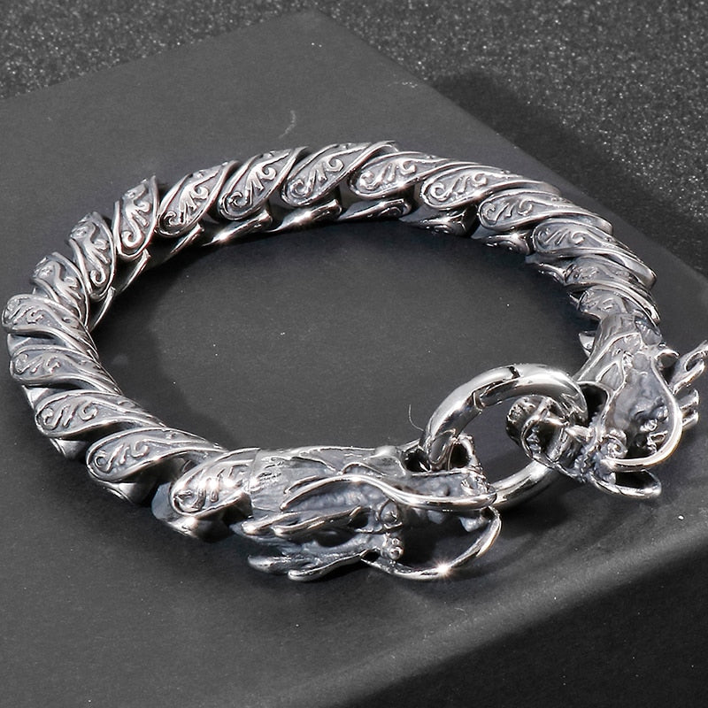 Pulsera de cadena de eslabones vintage para hombre con doble cabeza de dragón, de acero inoxidable macizo, con acabado de metal antiguo.