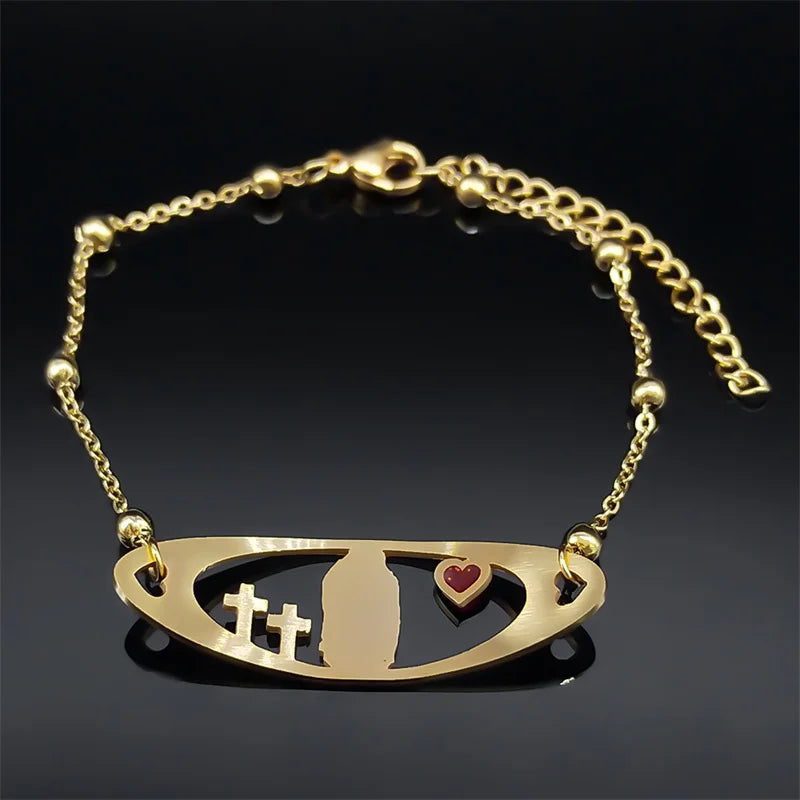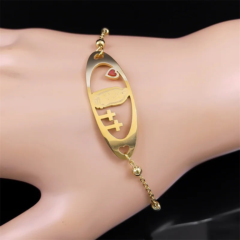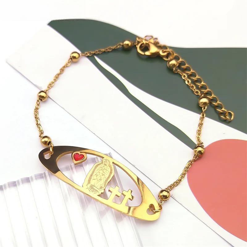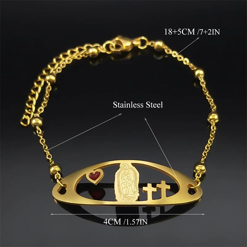 Pulsera Virgen María Guadalupe para mujer, acero inoxidable, color dorado, cruz, rosario, regalos para amigas, joyería, pulseras.