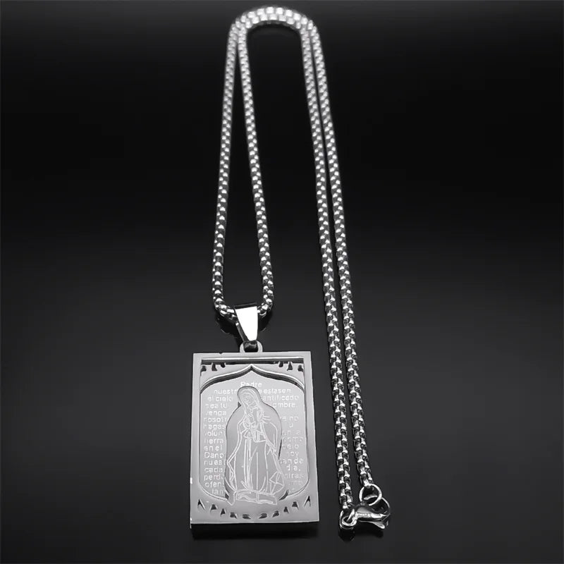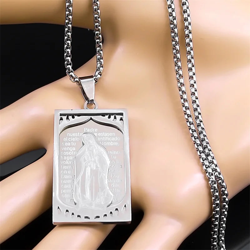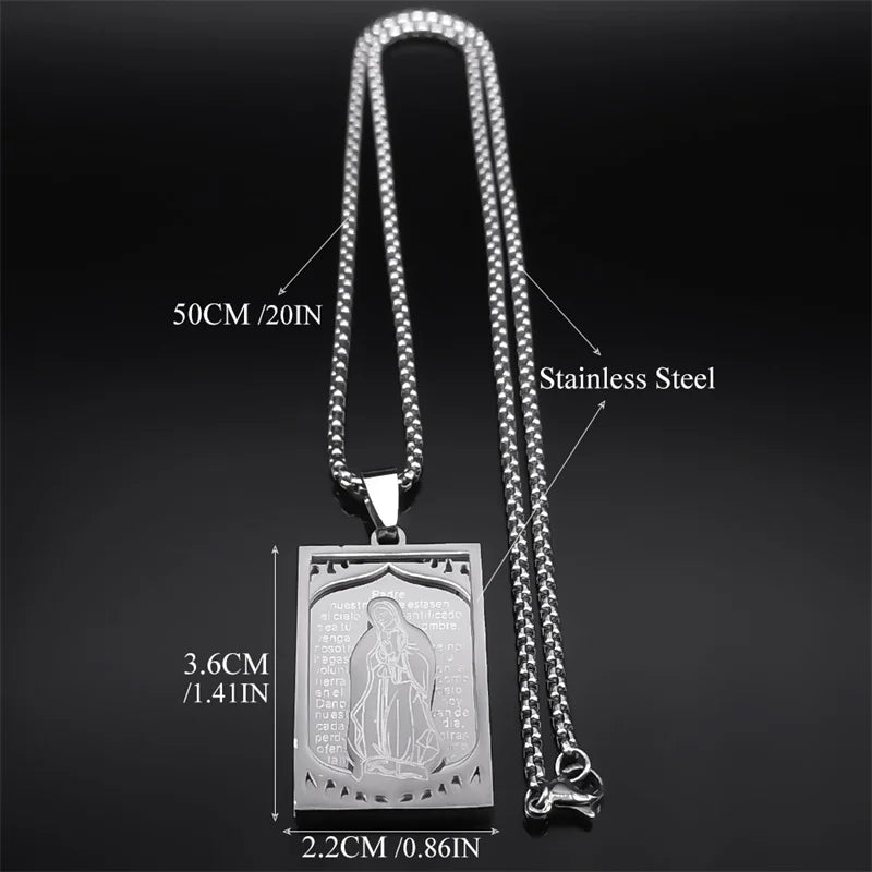 Collar con medalla de la Virgen María para mujer y hombre, de acero inoxidable, con versículo bíblico del Señor en español, joyería de Nuestra Señora de Guadalupe
