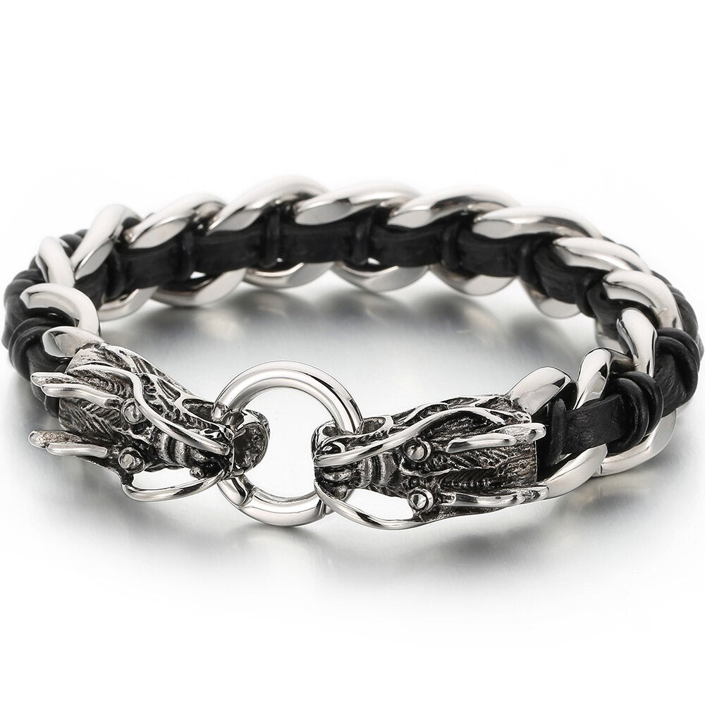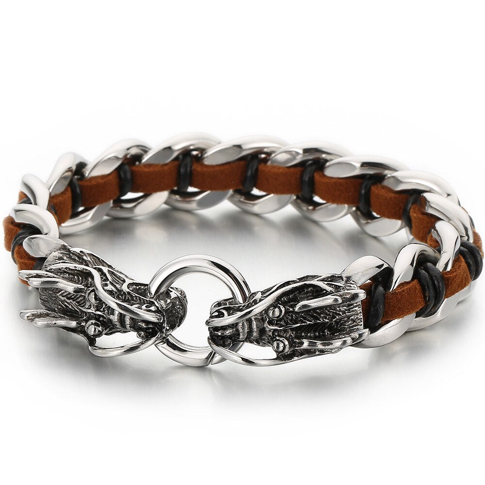 Pulsera de cuero trenzado con diseño de lobo punk para hombre con forma de calavera de dragón
