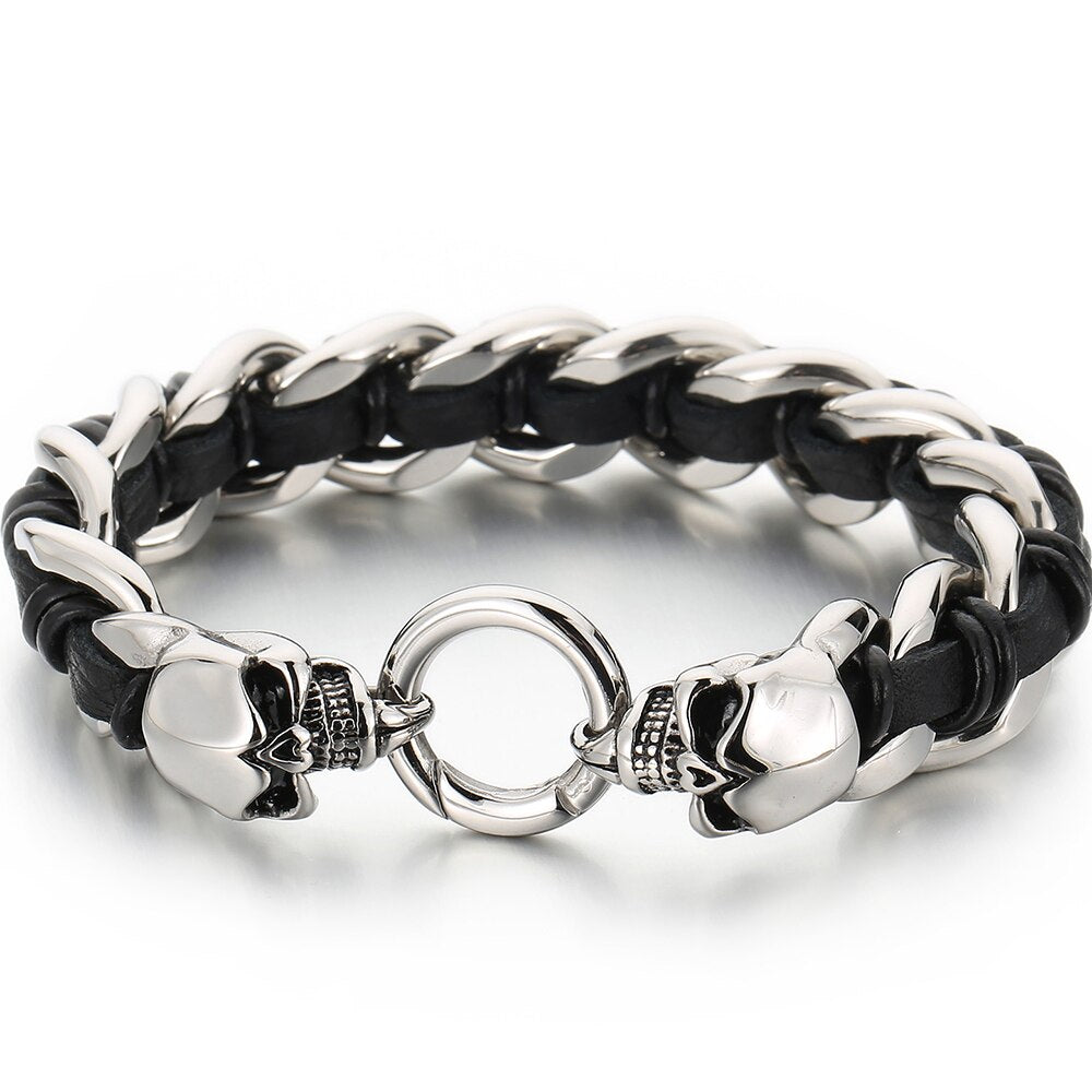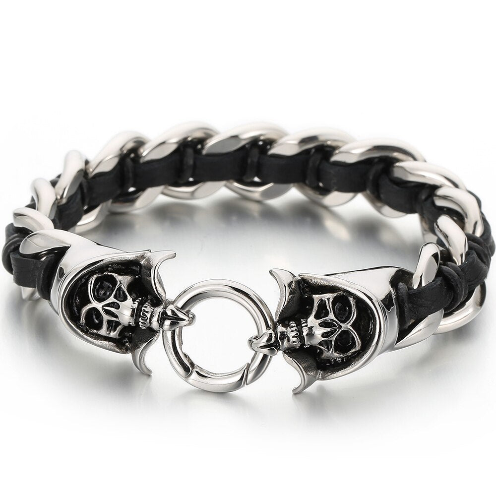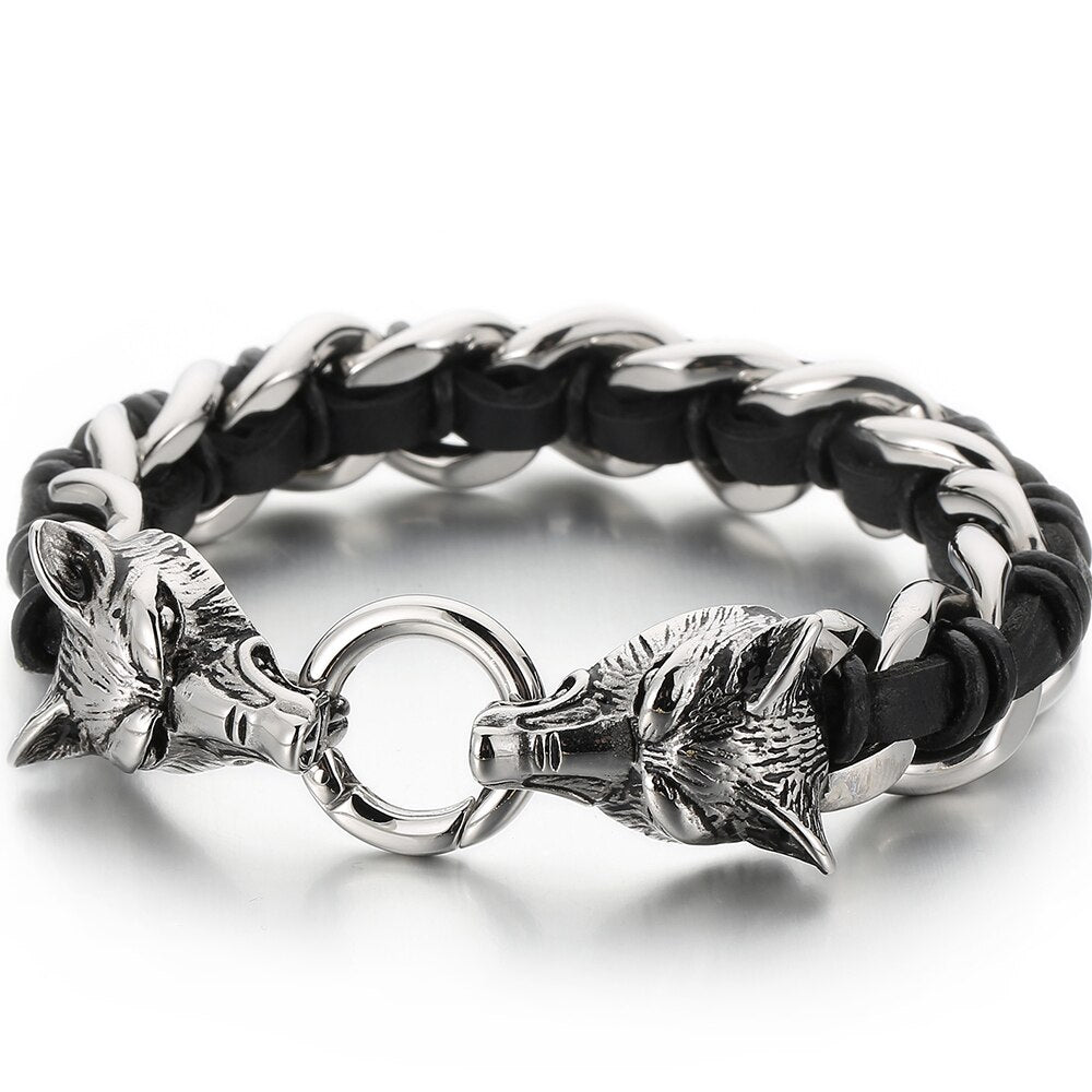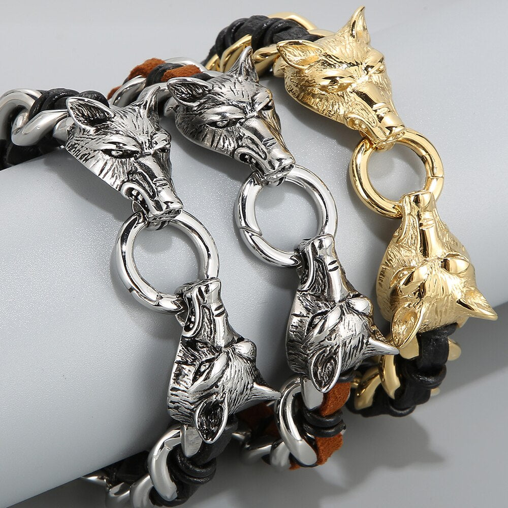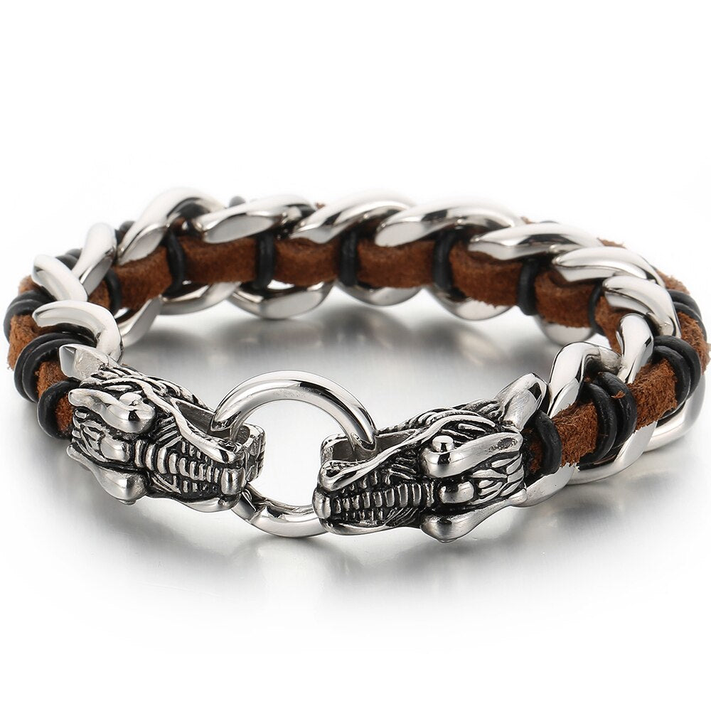 Pulsera de cuero tejido estilo punk con diseño de lobo para hombre, con forma de calavera de dragón, pulseras con dijes de mano para hombre, joyería gótica de acero inoxidable de lujo.