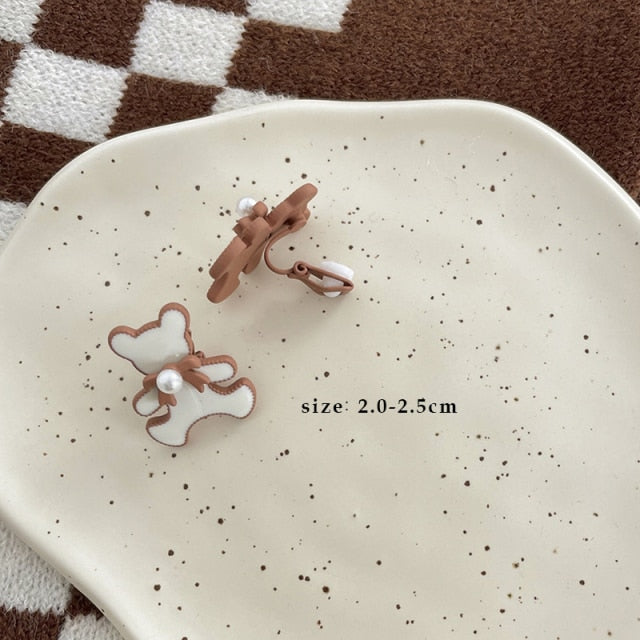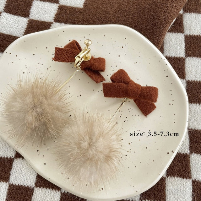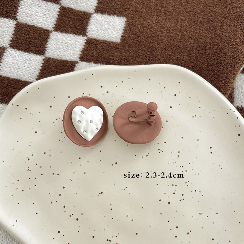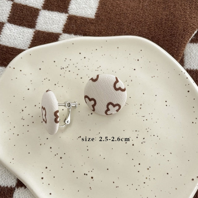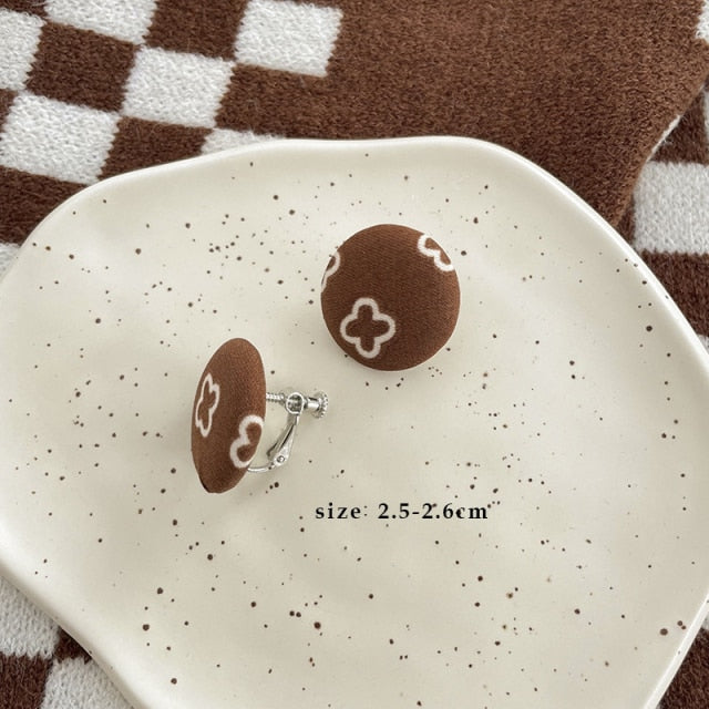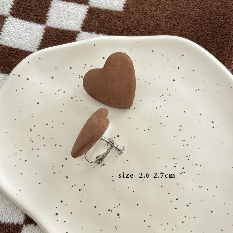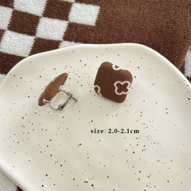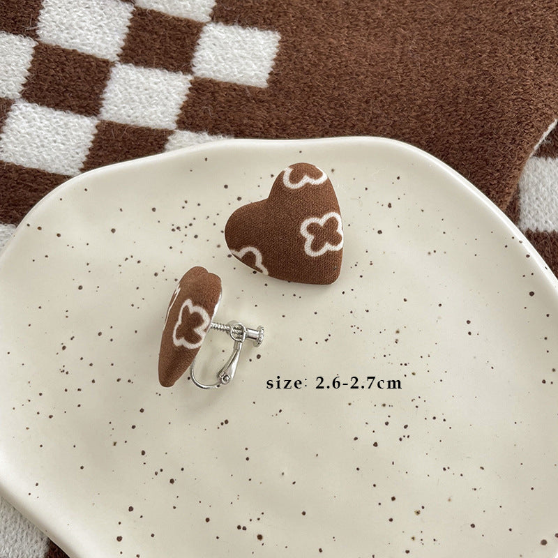 Pendientes de clip con forma de corazón redondo geométrico sin perforar de tela marrón retro de invierno para mujer, para uso diario.