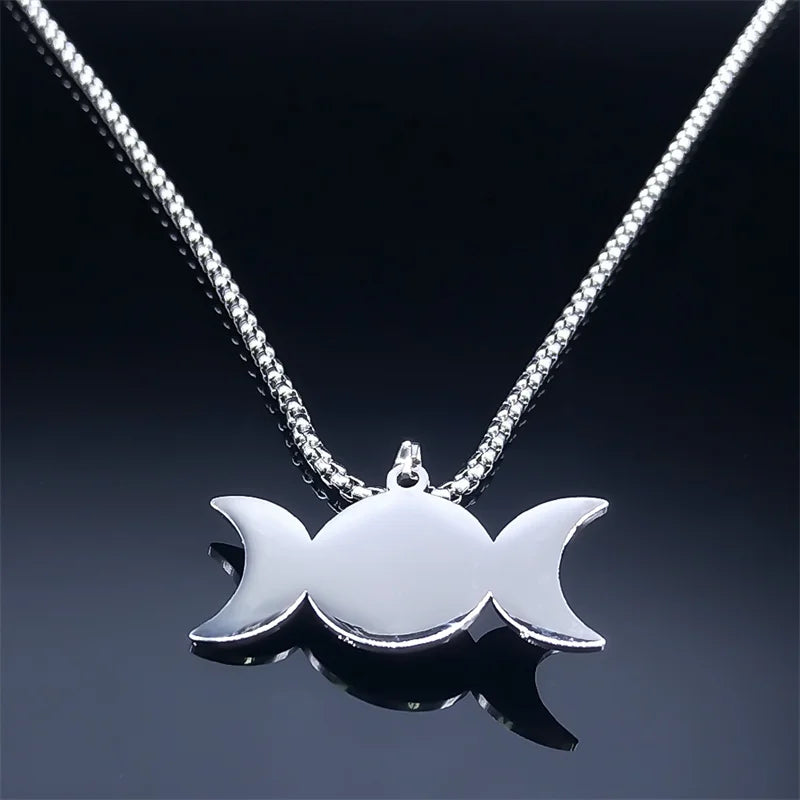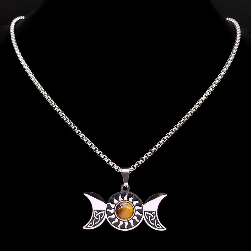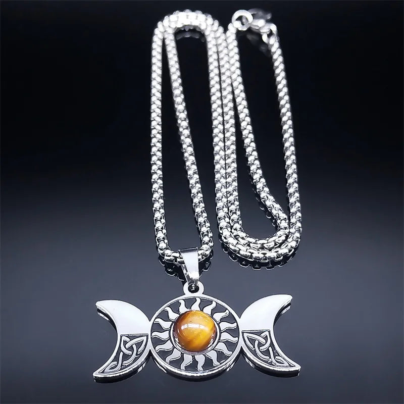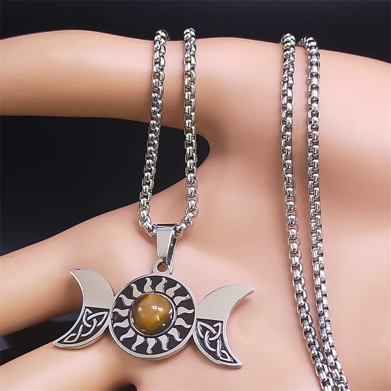 Collar de nudo celta de la diosa de la triple luna de bruja, acero inoxidable, ojo de tigre, wicca, trinidad, pentagrama, sol, collares, joyería