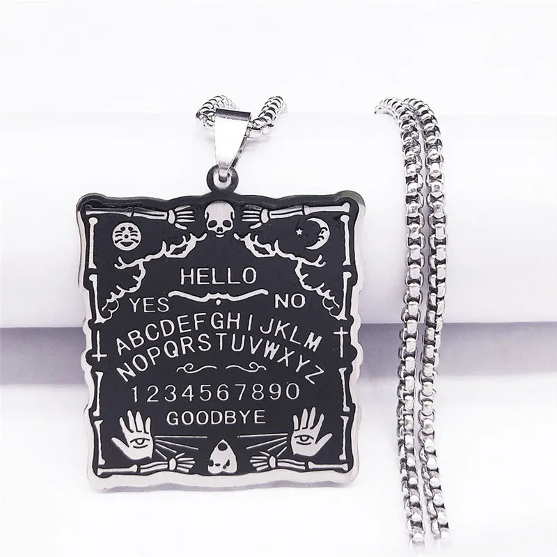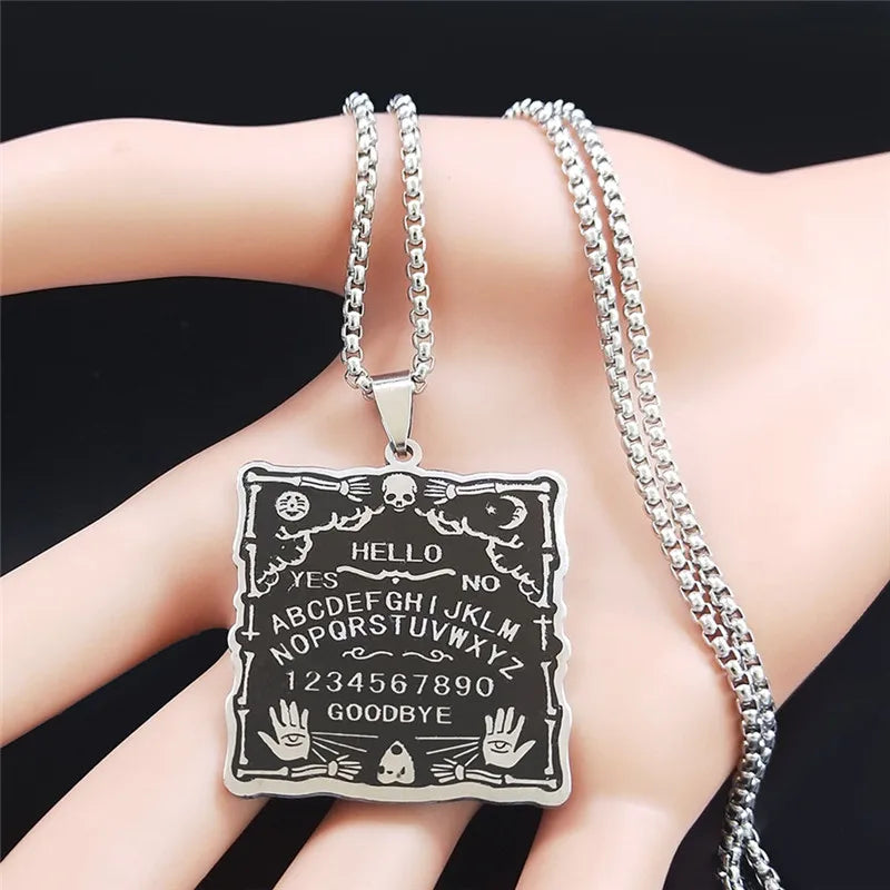 Collar de acero inoxidable con diseño de tablero Ouija, de brujería, adivinación, sol, luna, mano, calavera, color plata, joyería, collares de acero inoxidable