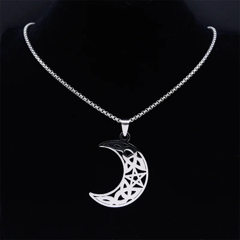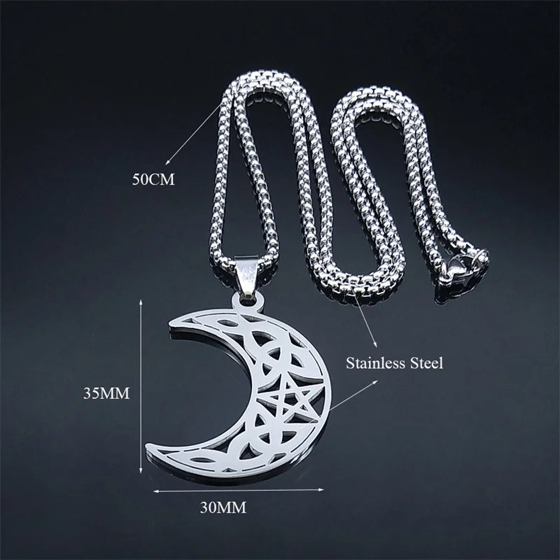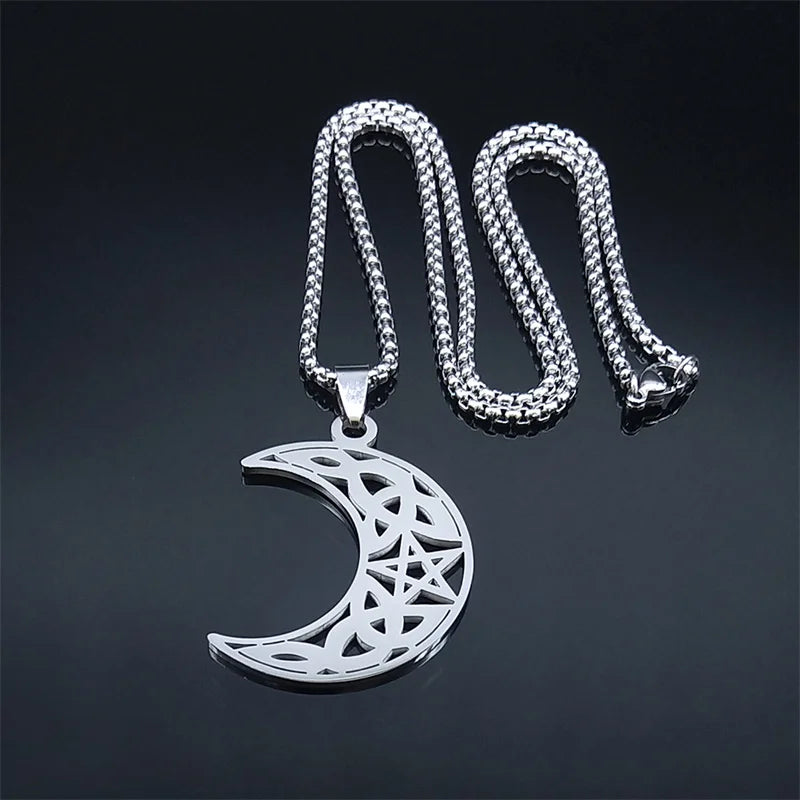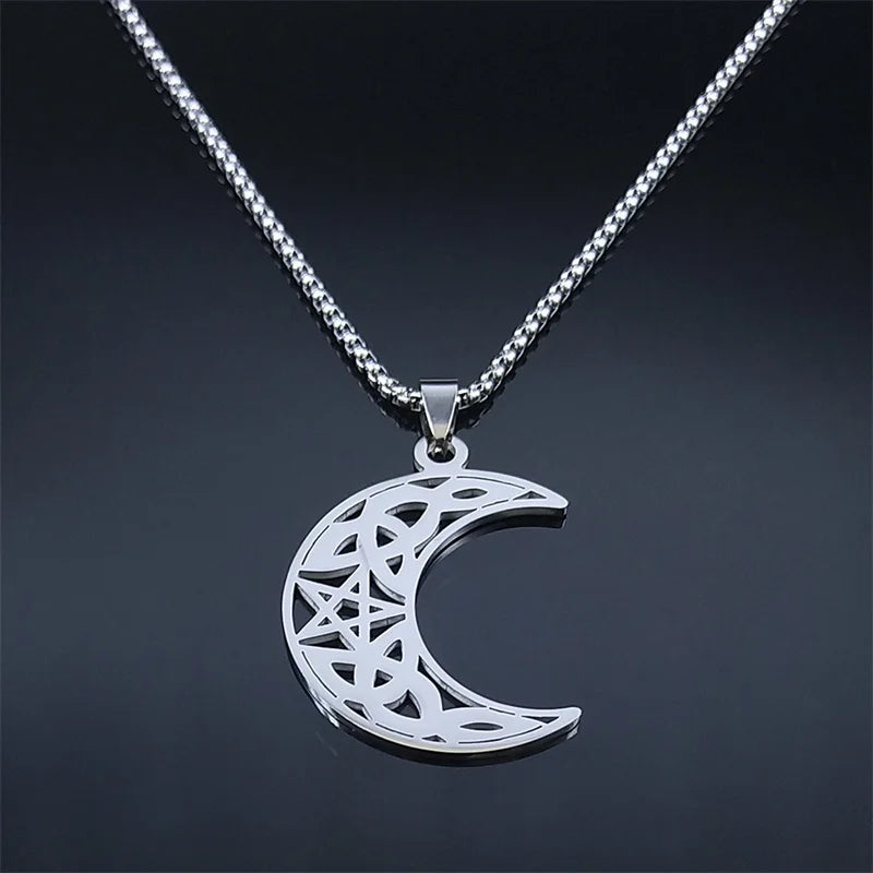 Collar de acero inoxidable con colgante de luna creciente y estrella de brujería, nudo irlandés, símbolo de la trinidad, joyería nudo de bruja