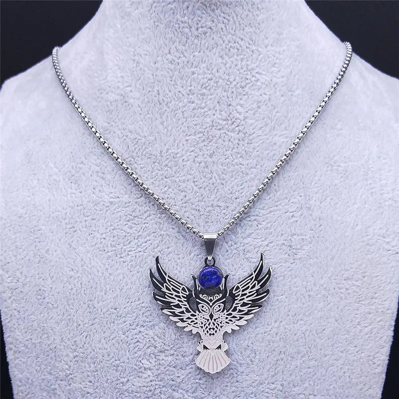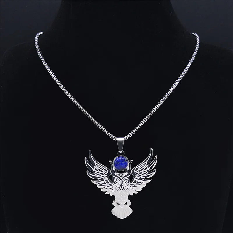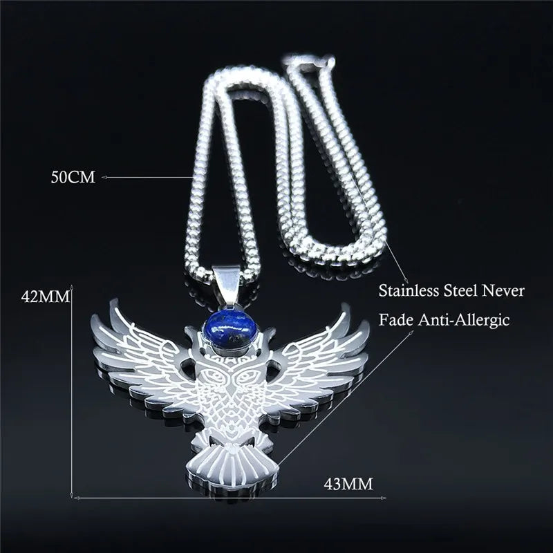 Collar con colgante de acero inoxidable, diseño de búho brujo, punta de lanza y águila, color plata y lapislázuli.