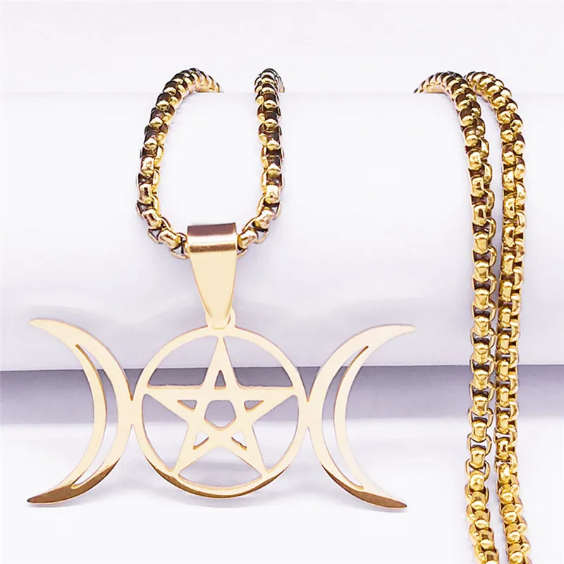 Collares de acero inoxidable con diseño de pentagrama, sol y luna, de brujería, colgantes para mujer y hombre, cadena de color dorado, joyería femenina.