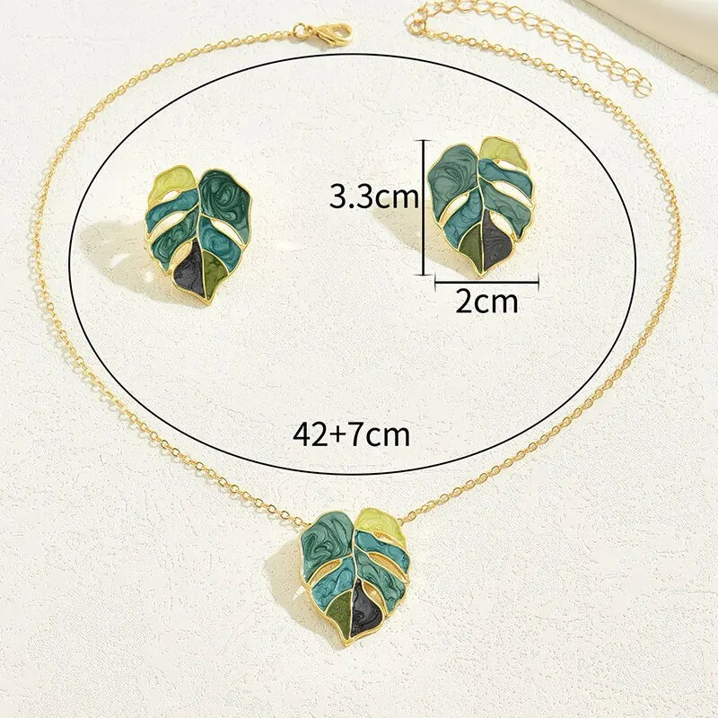 2 PCS Set Boho Epoxy Leaf Shape Necklace Ear Stud Temperament Gold-color Link Chain