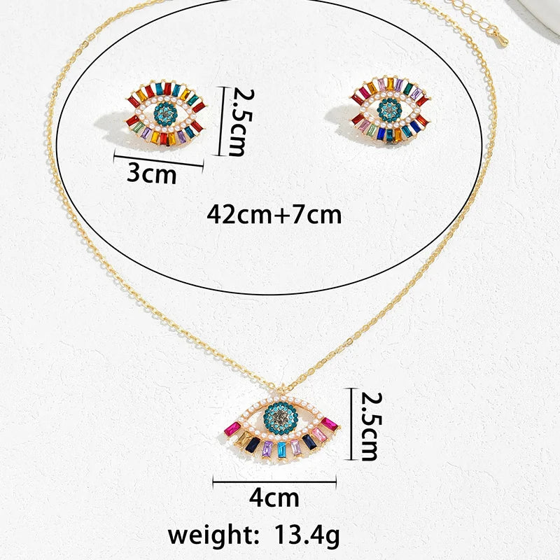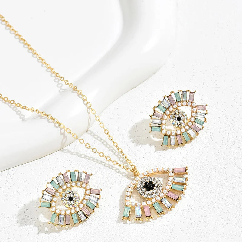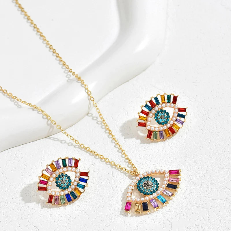 2 PCS Set Multi Color Crystal Evil Eye Necklace Earrings Trendy Design Colorful Full Stone Pendant Necklace Earring Jewelry Set