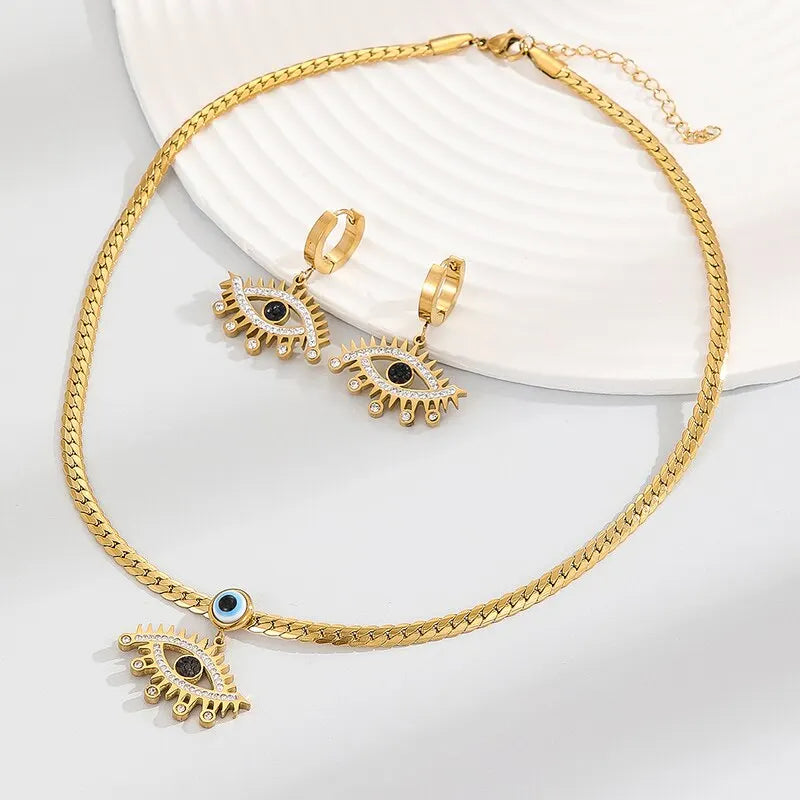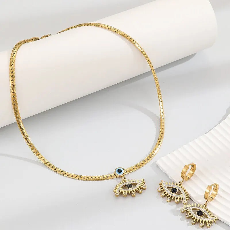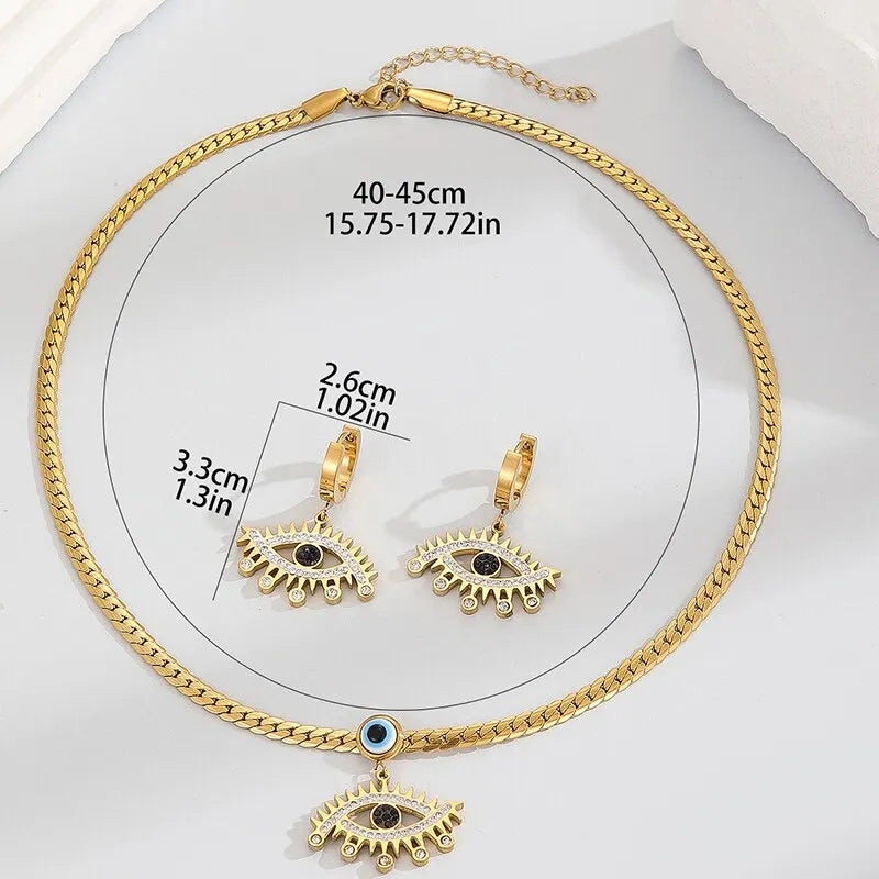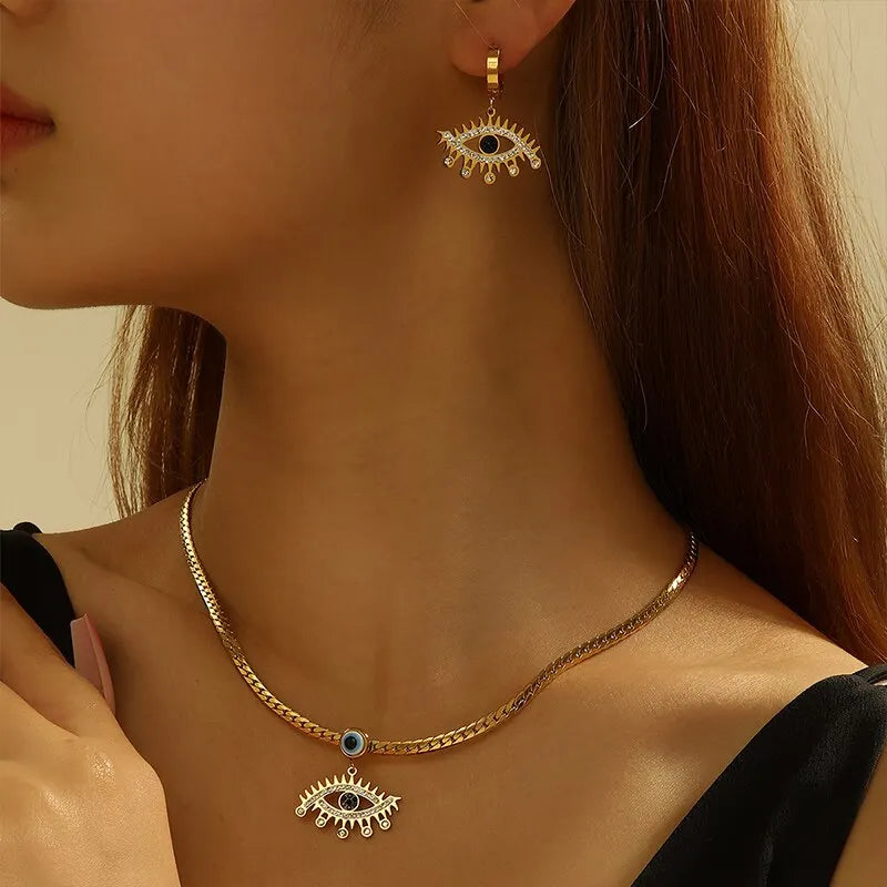 2 Pcs Set Turkry Bule Evil Eyes Pendant Snake Chain Necklace Shiny Cubic Zircon Attractive Gold Color Copper Fashion Jewelry