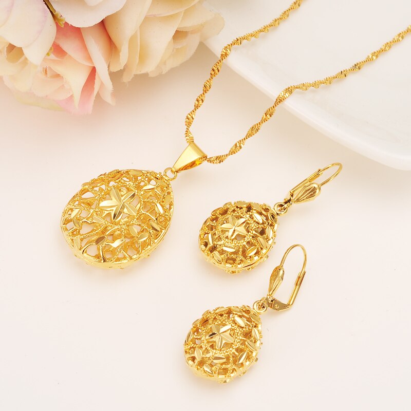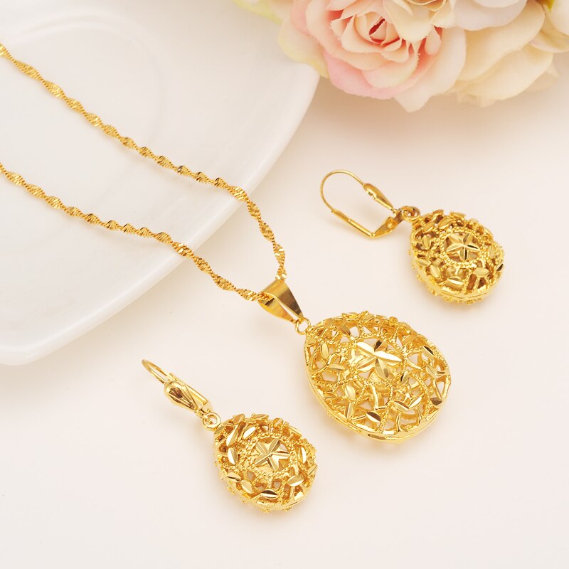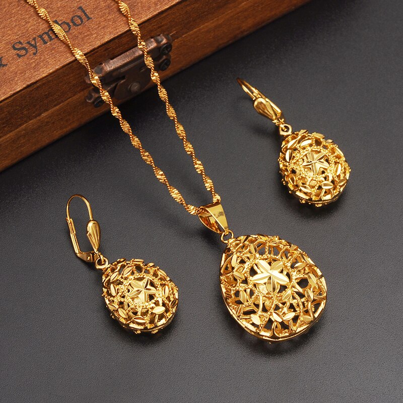 Afraic Jewelry-24K Ethiopian set women Jewelry Pendant Necklace Earring Gold Color hollow African Bridal Wedding Jewellery Arab girl charmsgift