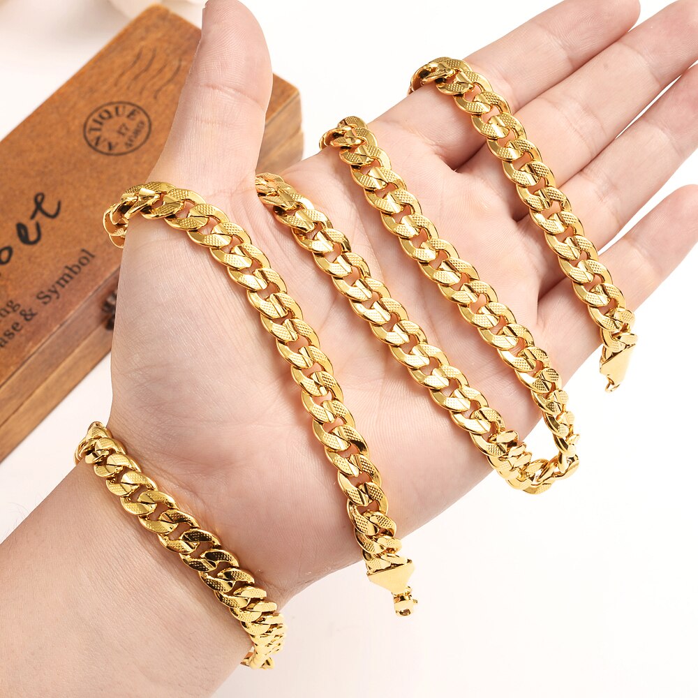 Afraic Jewelry-24k New big chunk gold 60cm Necklace 21cm bracelet Trendy 9MM Width Cuban Chain Men Necklace Bracelet africa Jewelry Sets gifts