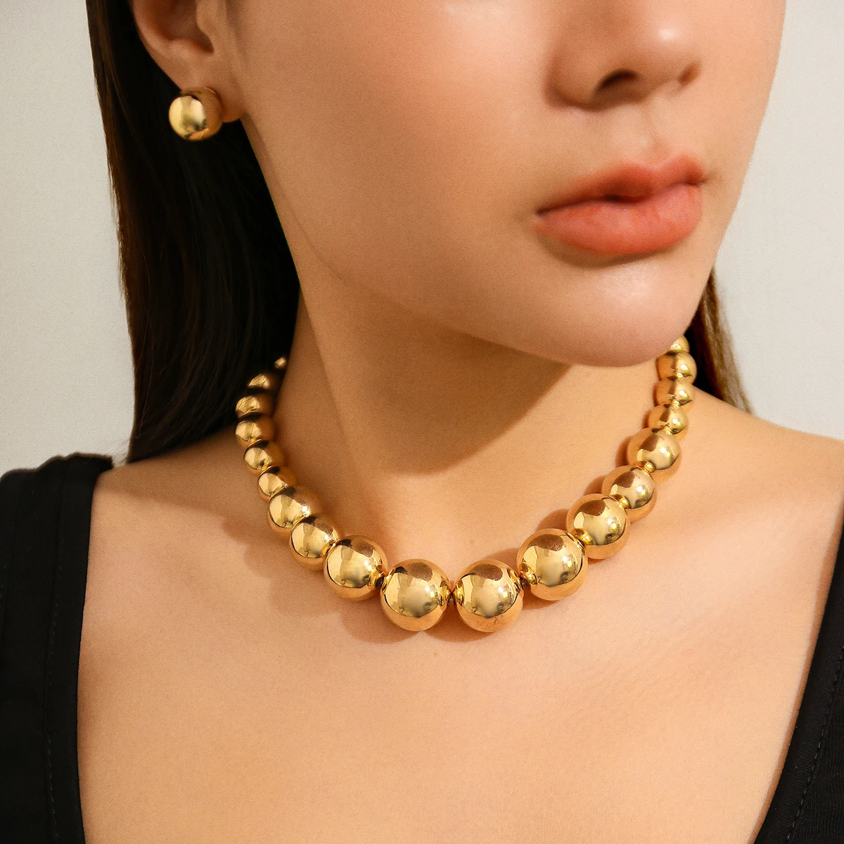 2Pcs Exaggerated Gold Color Big Beads Necklace Stud Earrings for Women Luxury Punk CCB Choker Jewelry Set Party Club Accessories