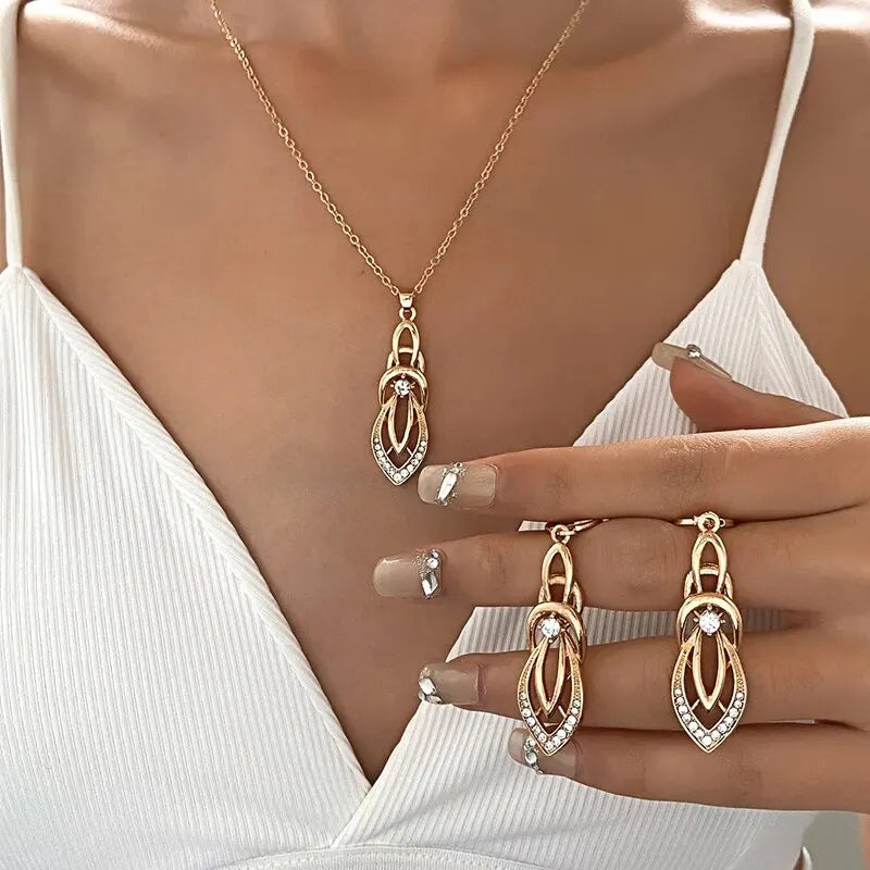 2PCS Vintage Geometric Shiny Zircon Jewelry Set Exquisite Pendant Necklace Hoop Earrings For Woman Trendy Style