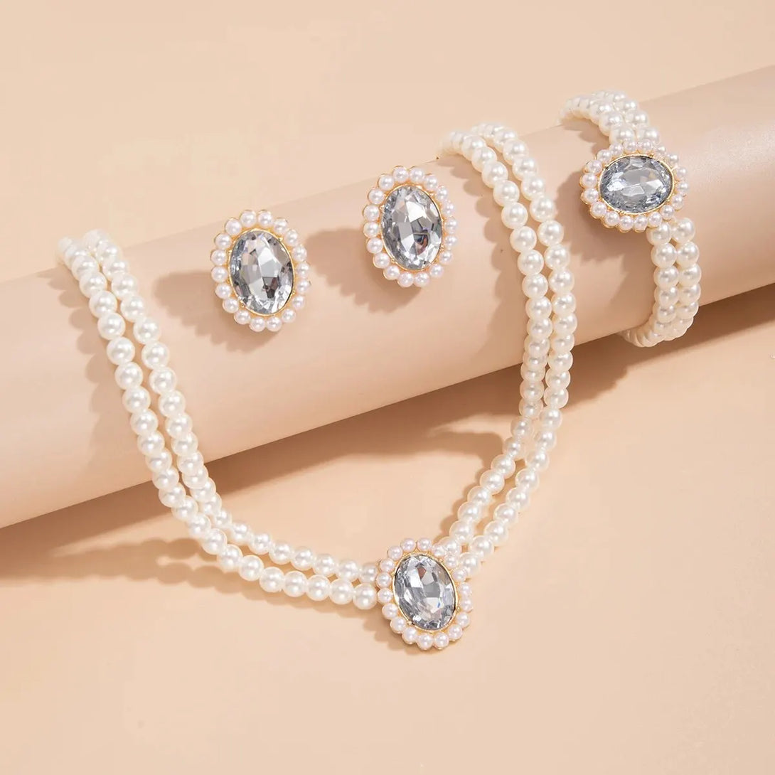3Pcs Elegant Imitation Pearl Chain Necklace Bracelet for Women Bridal Goth Rhinestone Stud Earrings Jewelry Set Wed Accessories
