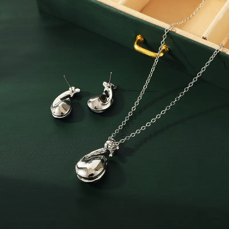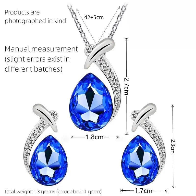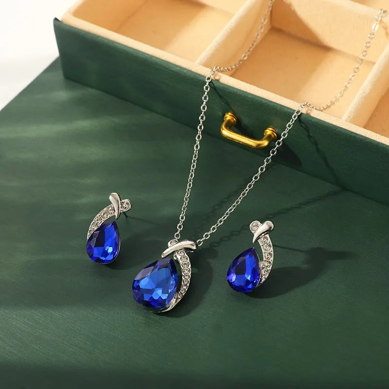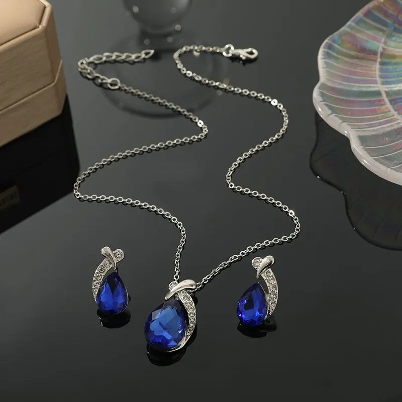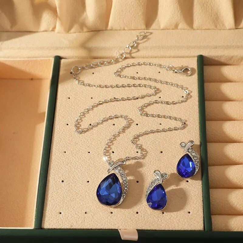 3pcs Necklace Earring Set Ladies Classic Crystal Glass Treasure Bluestone Imitation White Gold-color Jewelry