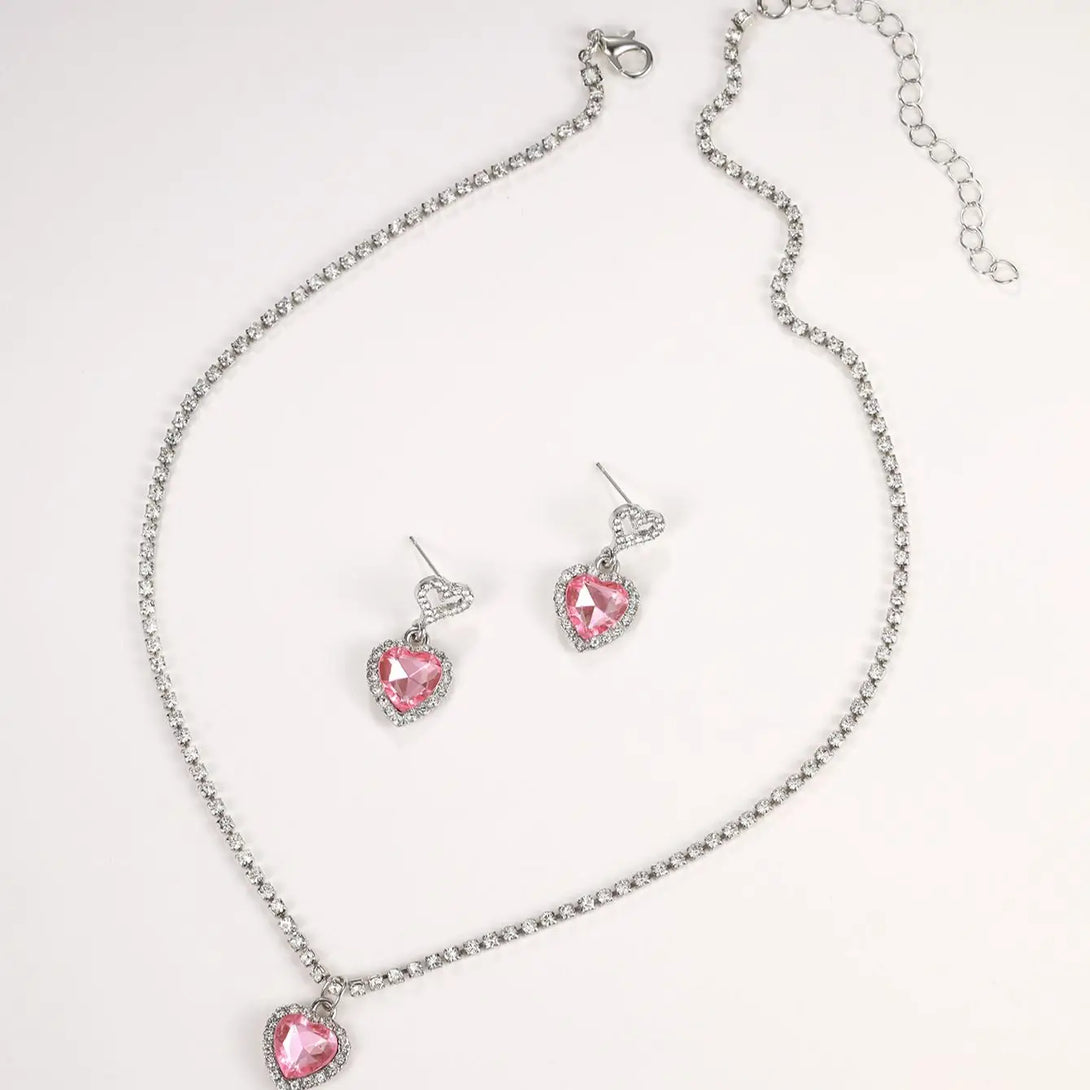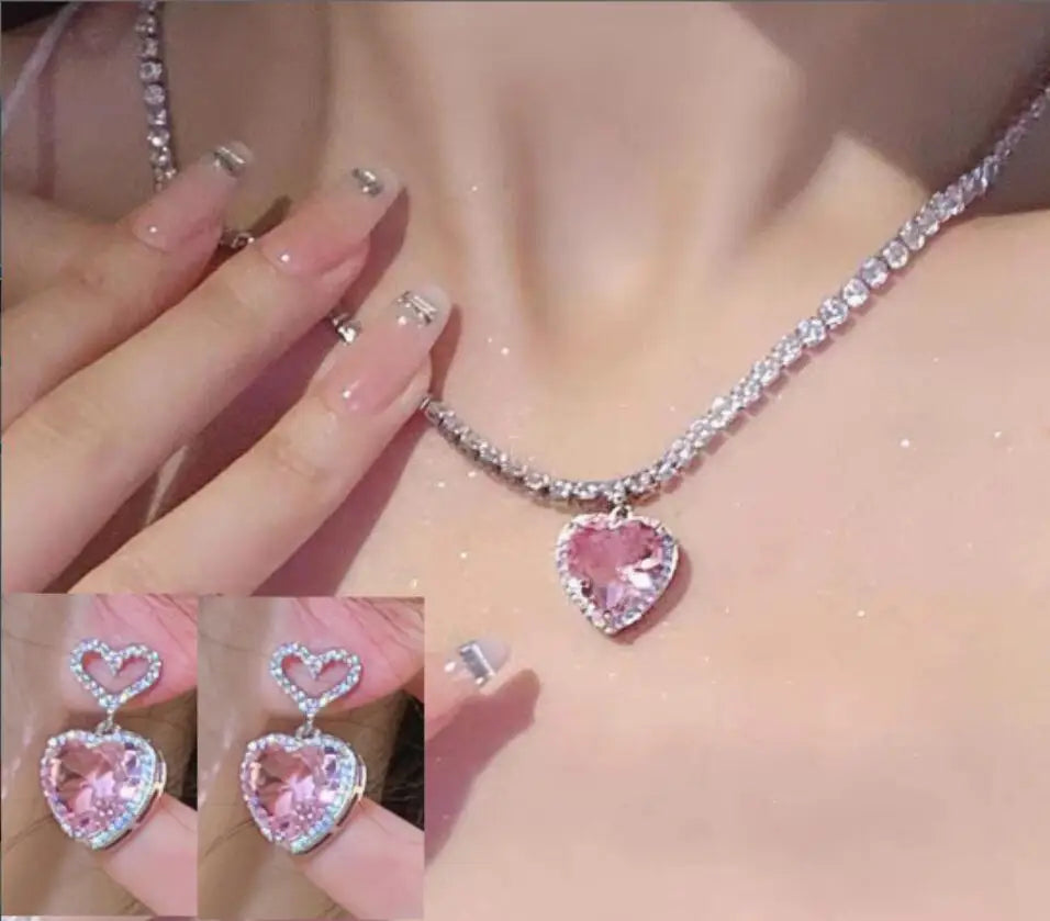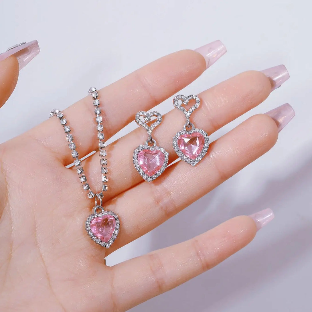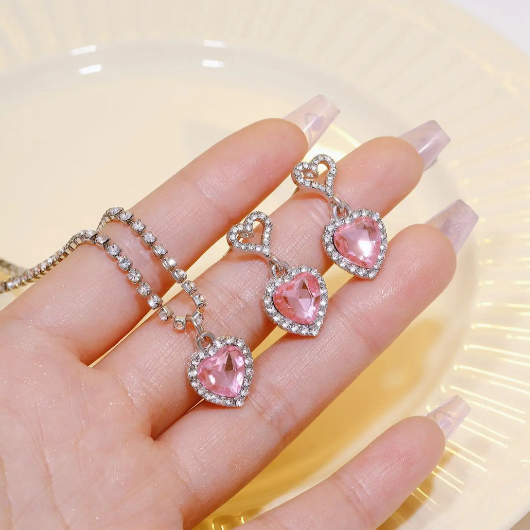 3Pcs Set Of Super Fairy Lovely Lady Jewelry Set Ins Style Pink Zircon Earrings Necklace Set