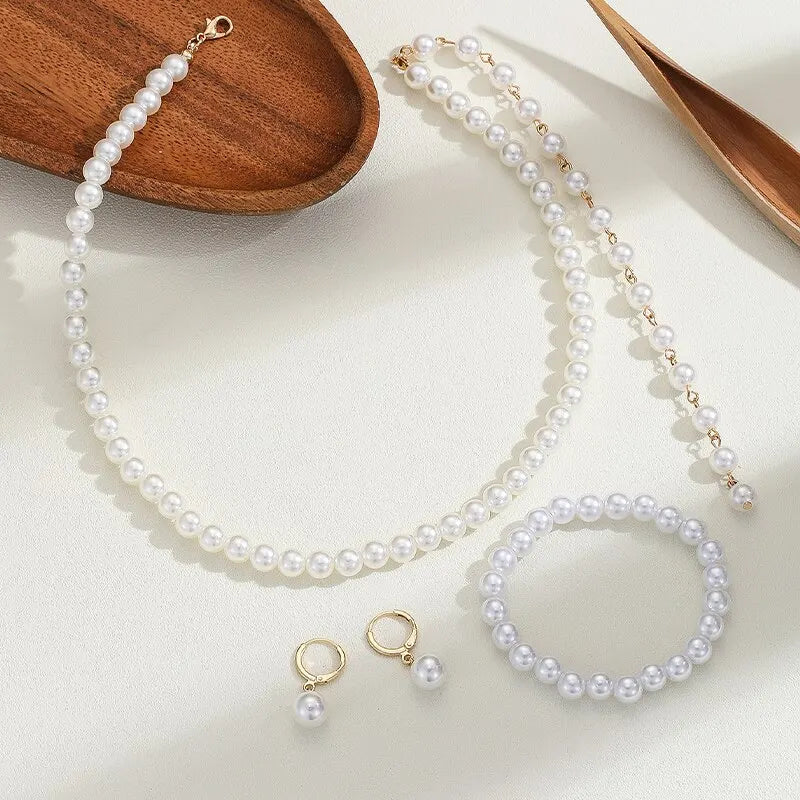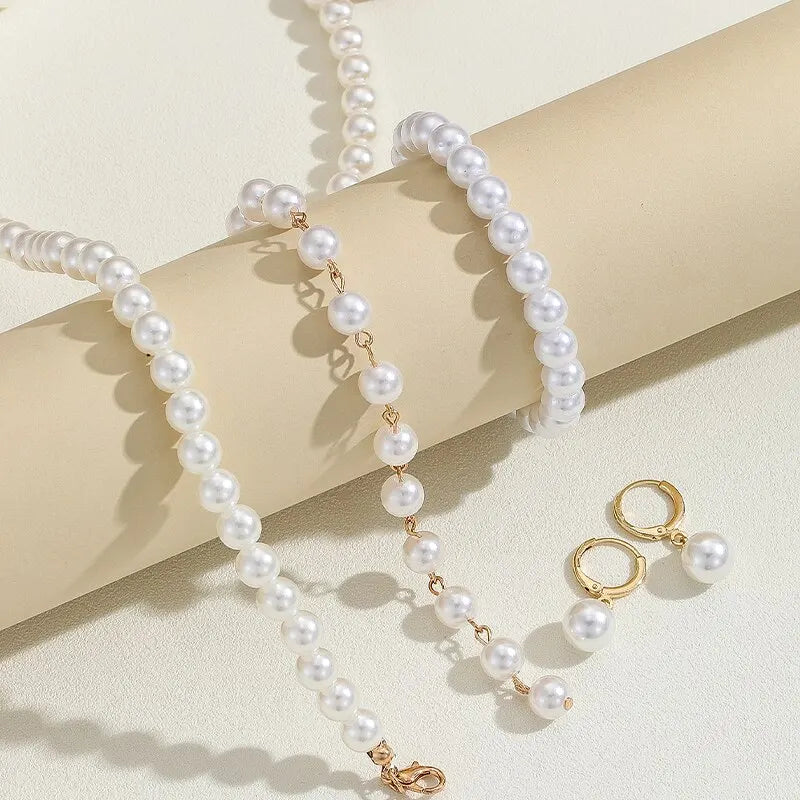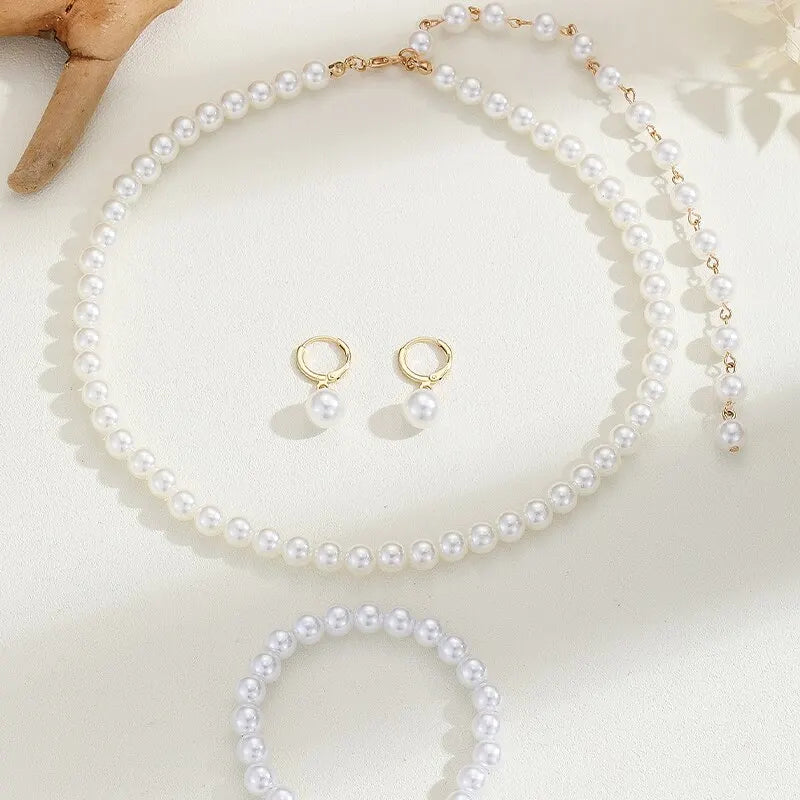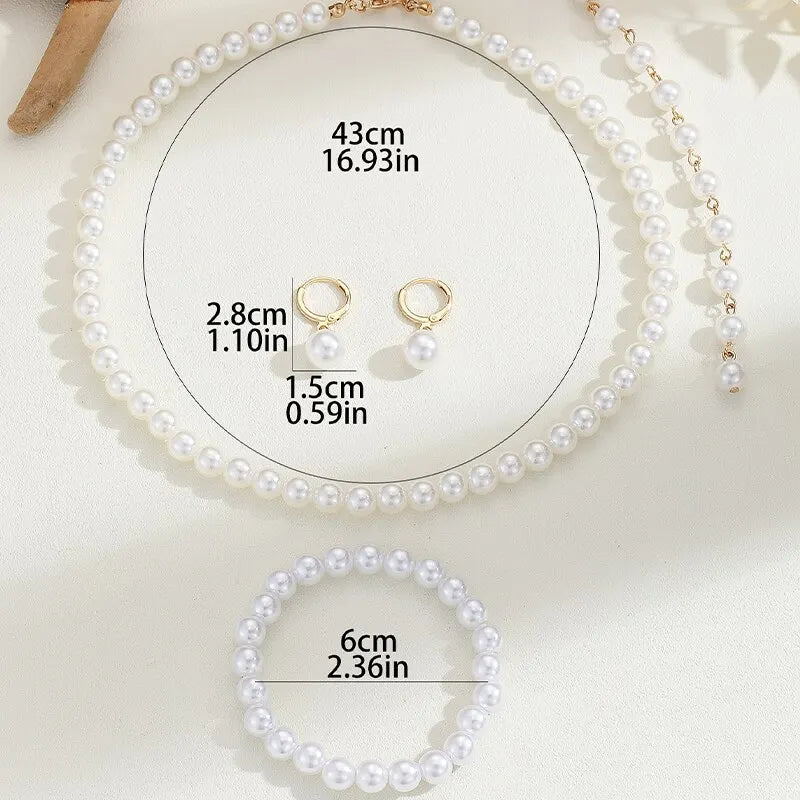 3PCS White Imitation-Pearl Jewelry Set Choker Necklace Hoop Earrings Bracelet Set For Woman Party Accessories Trendy Style