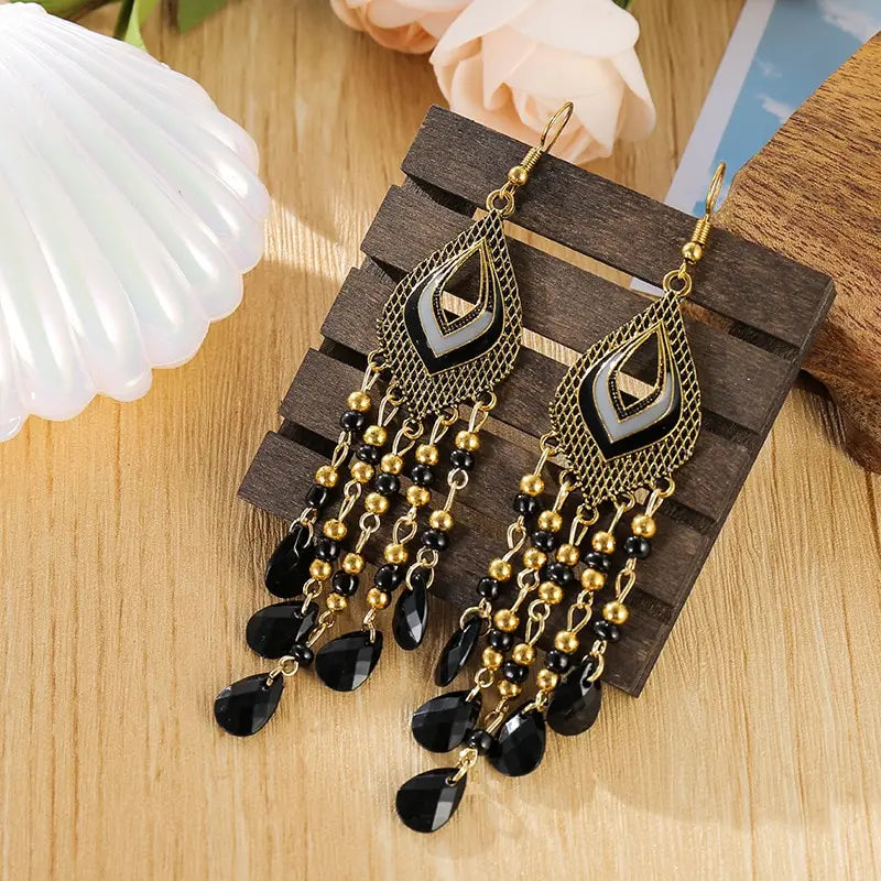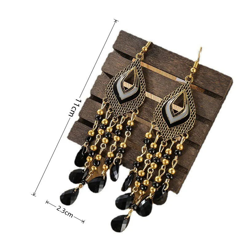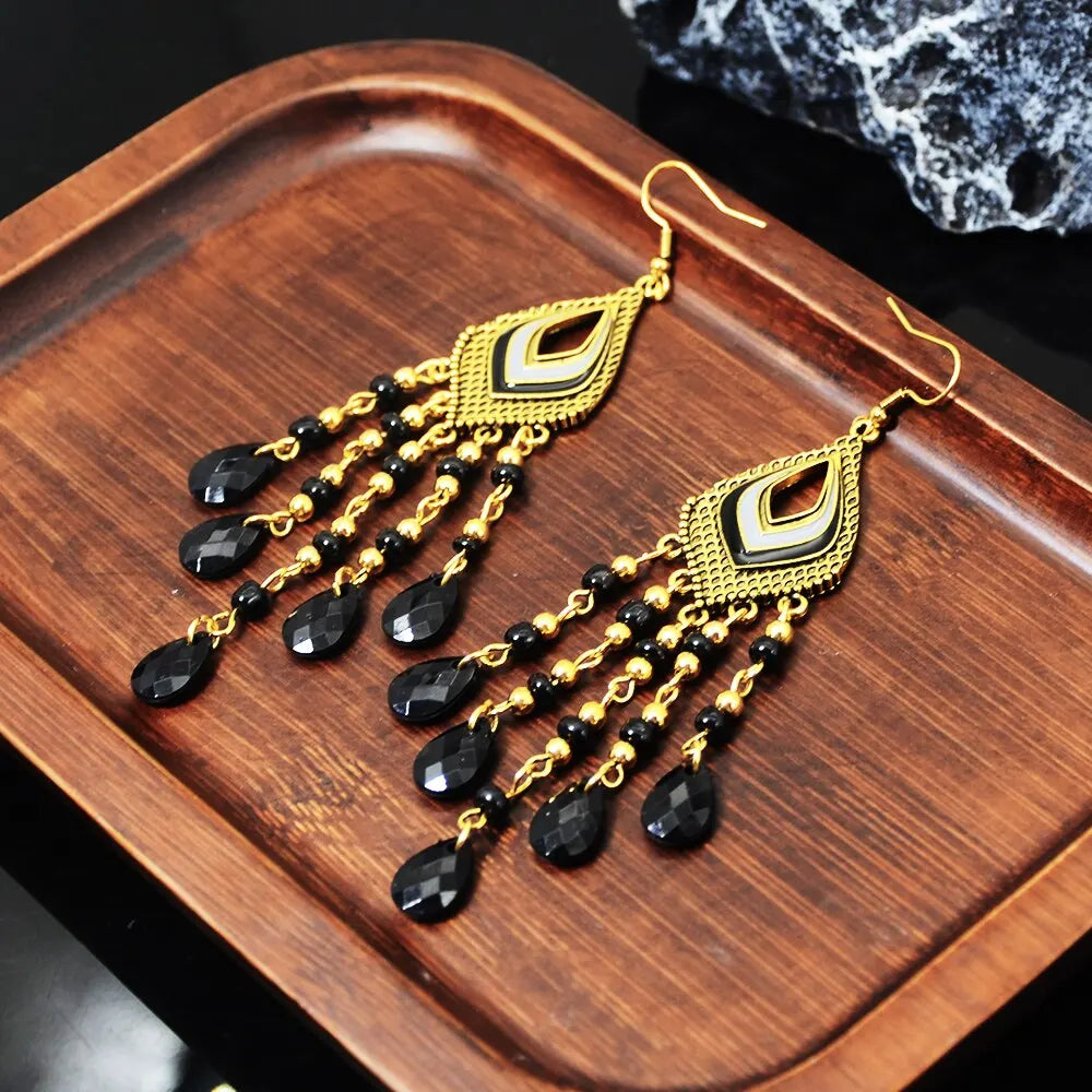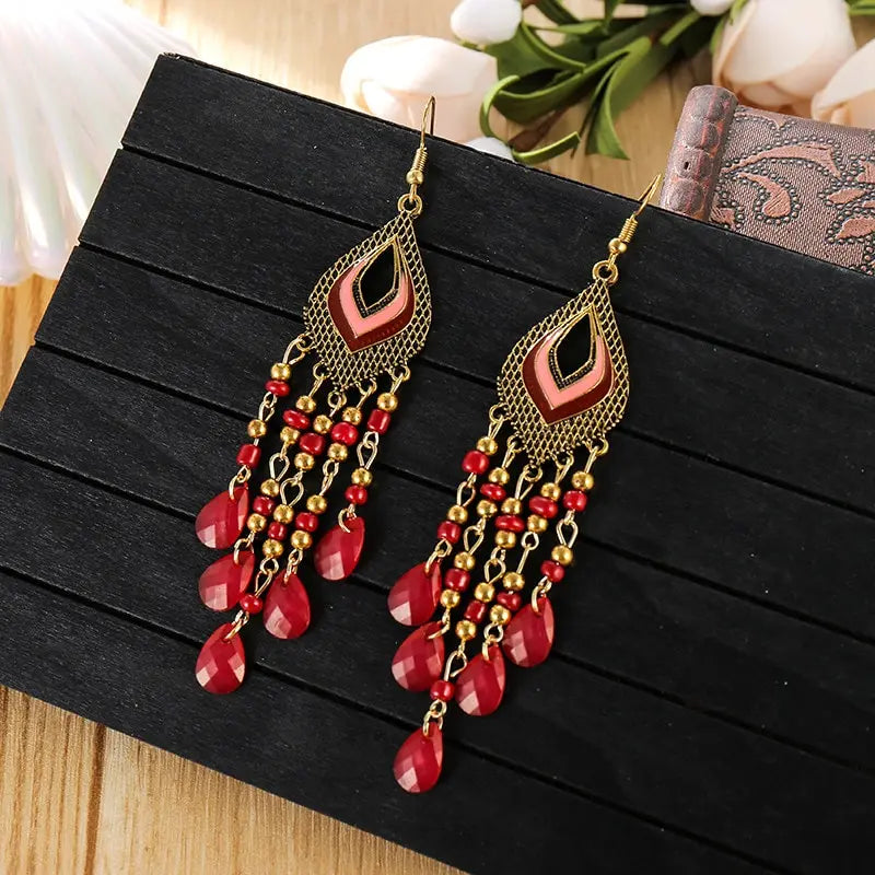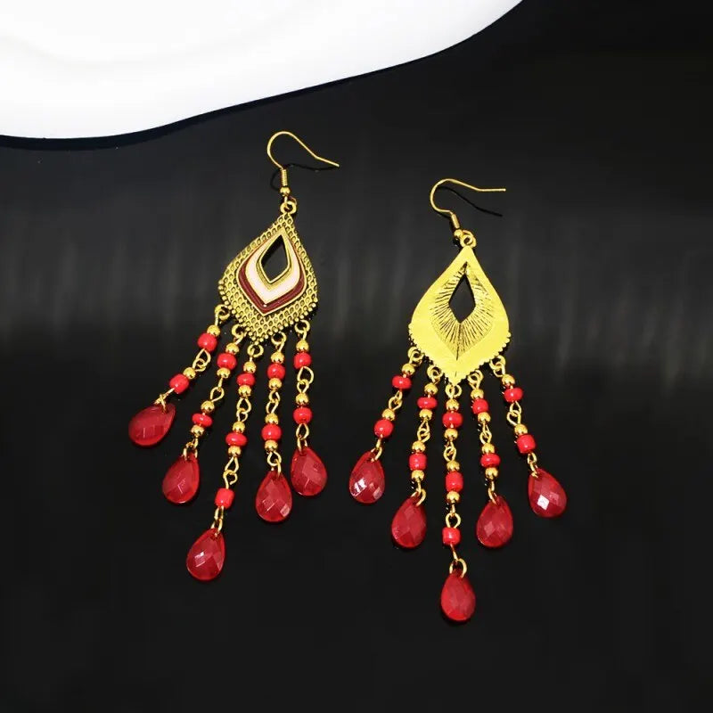 4pcs Earrings Ladies Classic Retro Ethnic Style Heart Shaped Drops Hand-curved Beads Tassel Models Black Plus Red Set