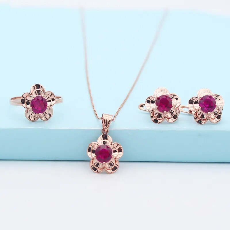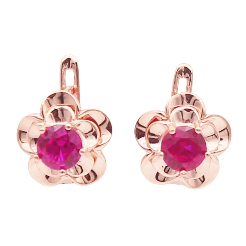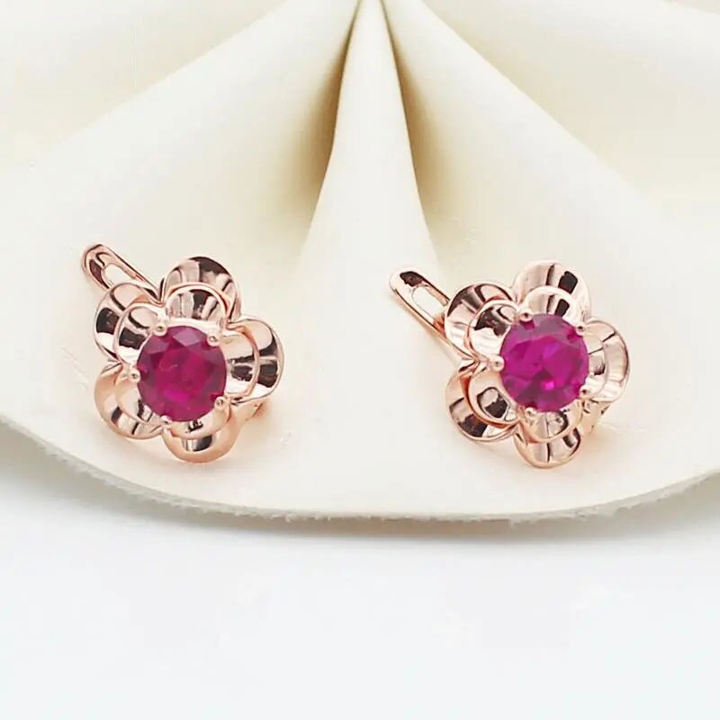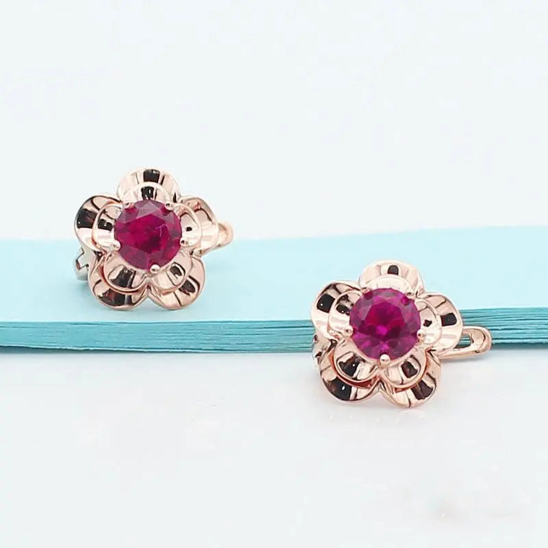 585 purple gold 14k rose gold inlaid with exquisite ruby flowers earrings for women