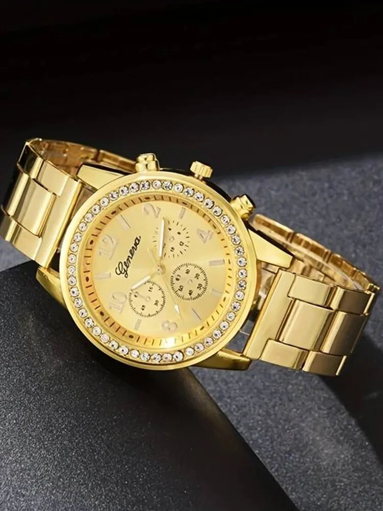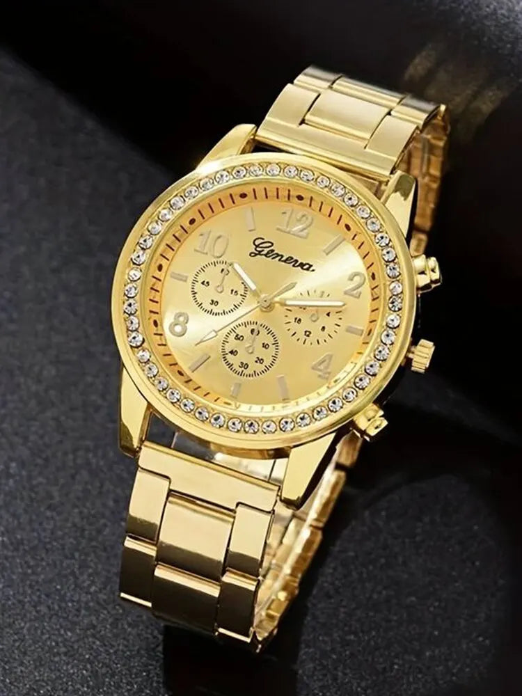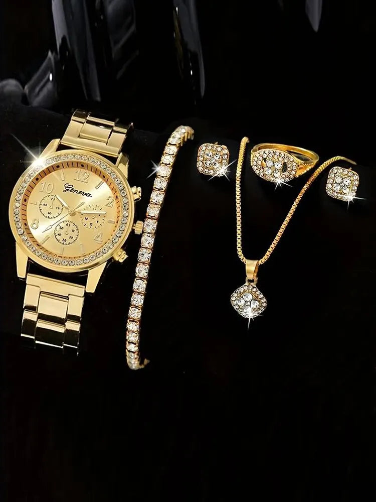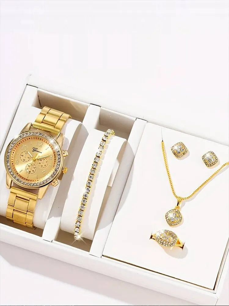6 Pieces of Fashionable and Versatile Diamond Inlaid Rhinestone WOMEN'S Gold Quartz Steel Band Watch+necklace+earrings+ring+brac