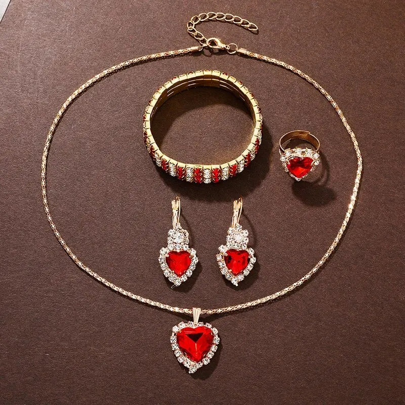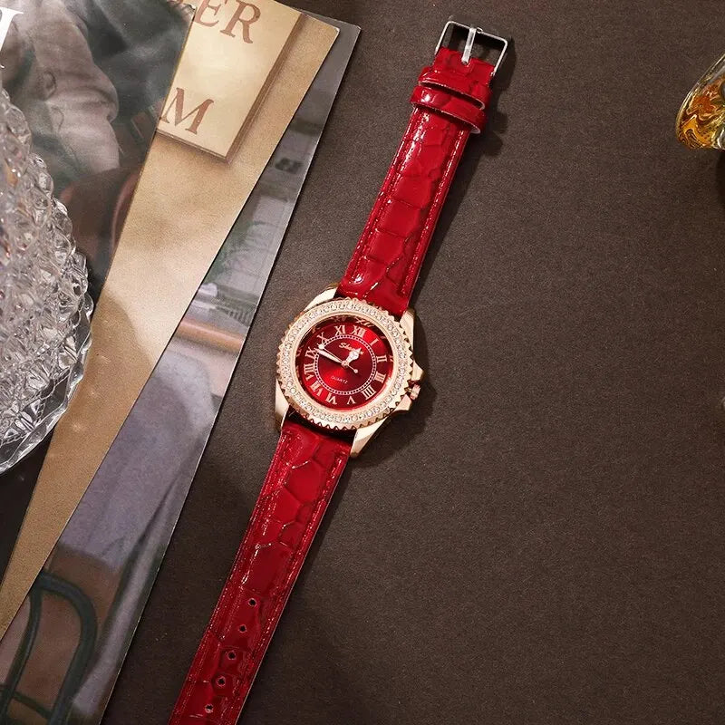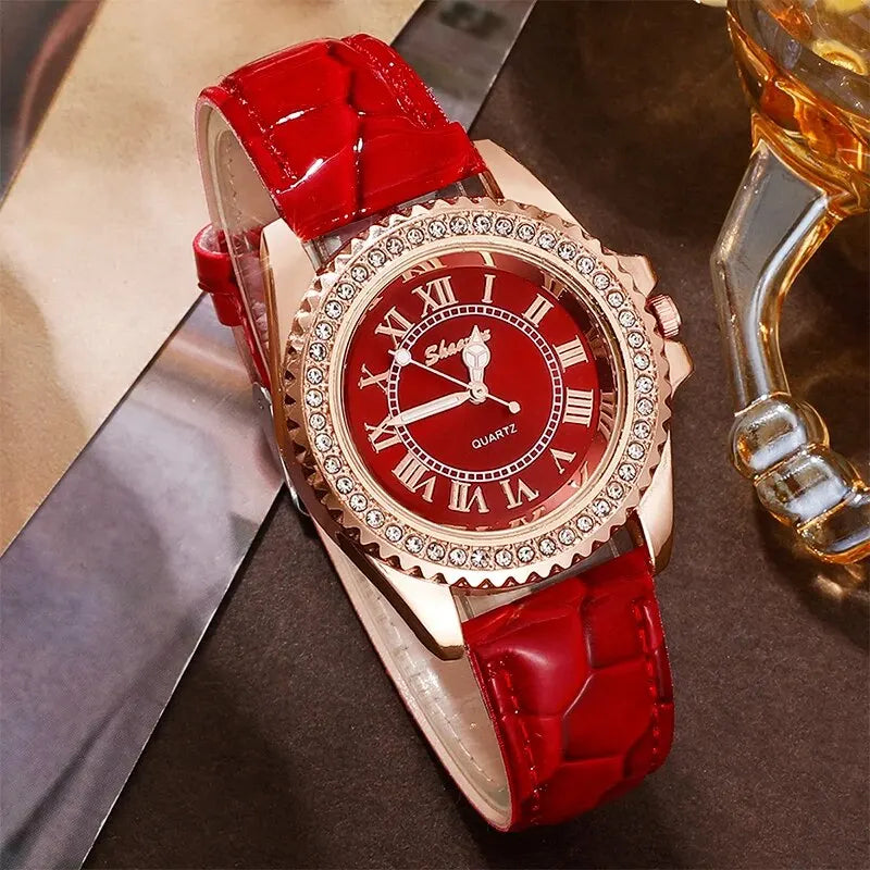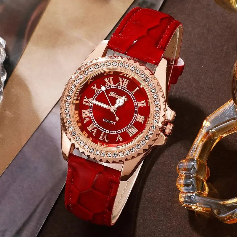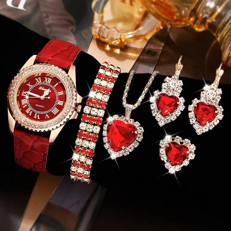 6PCS Set Red Luxury Watch Women Ring Necklace Earring Rhinestone Fashion Wristwatch Casual Ladies Bracelet Watches Clock Relogio