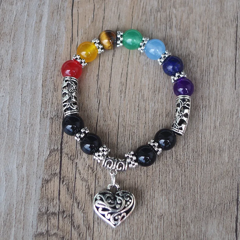 10MM Beads Mens Womens 7 Chakra Bracelets Bangle Crystals Stone Chakra Pray Mala Heart Charm Bracelet Jewelry.