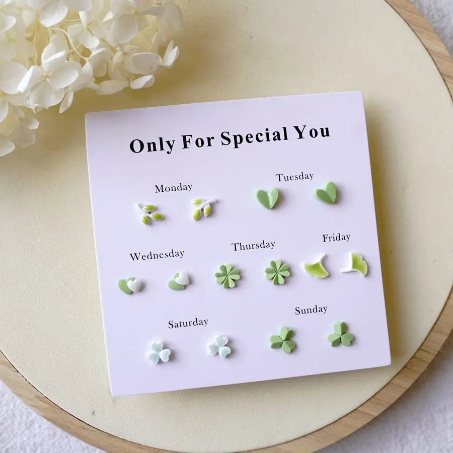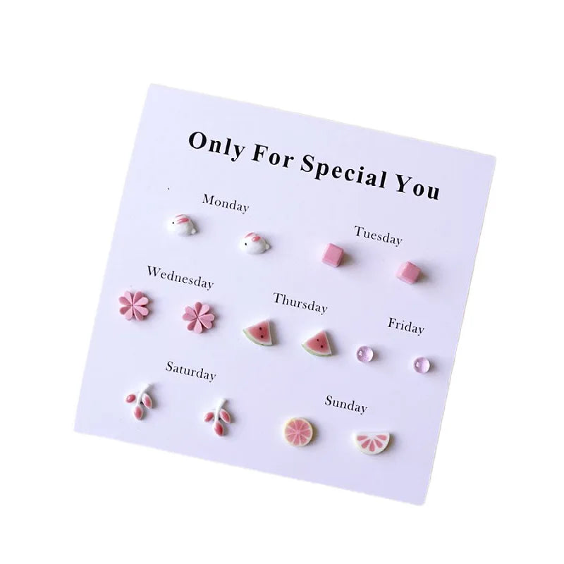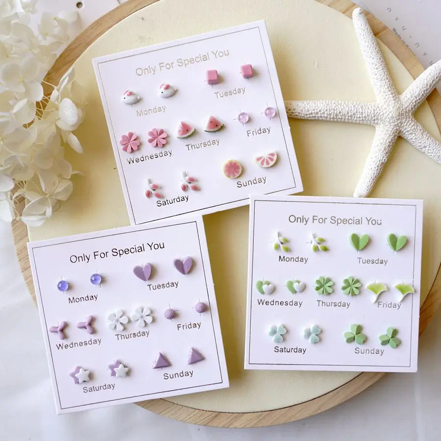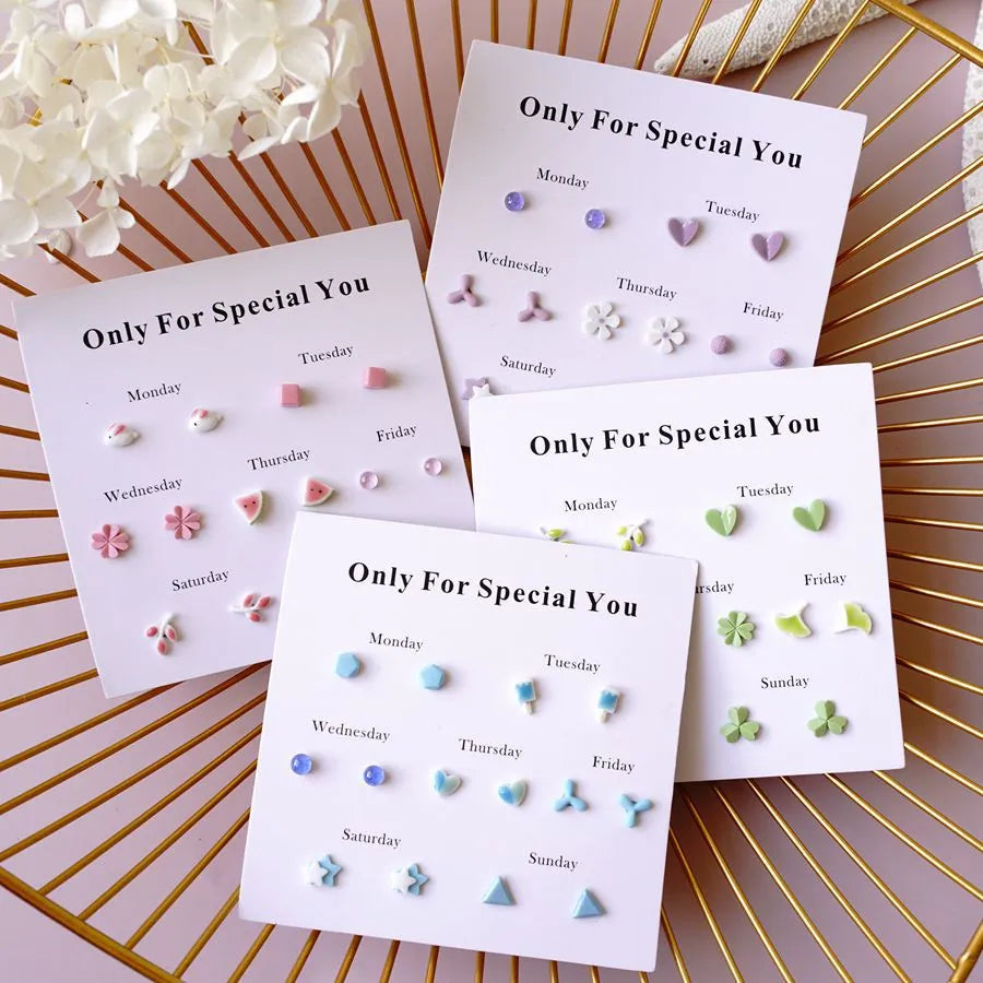7pcs Popular Ins Candy Color Week Mini Ceramic Earring Female Fresh Joker Temperament Combination Earrings