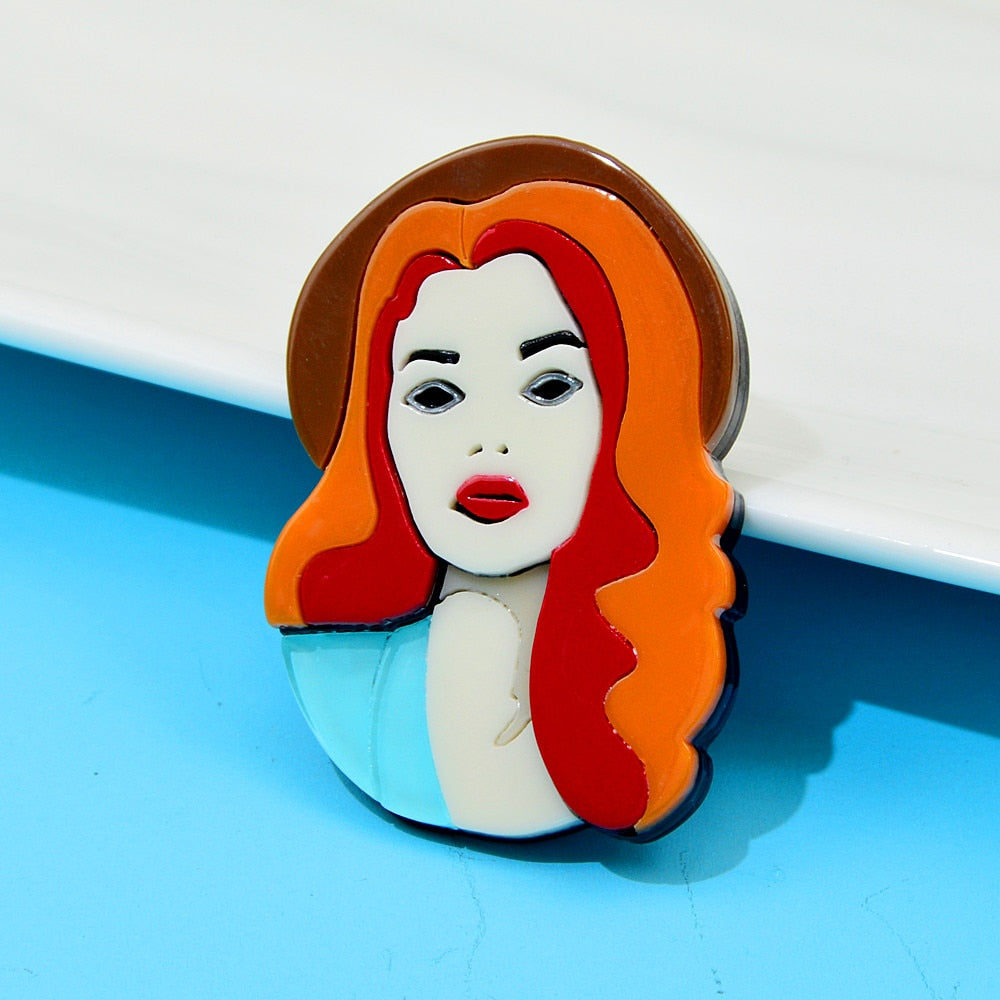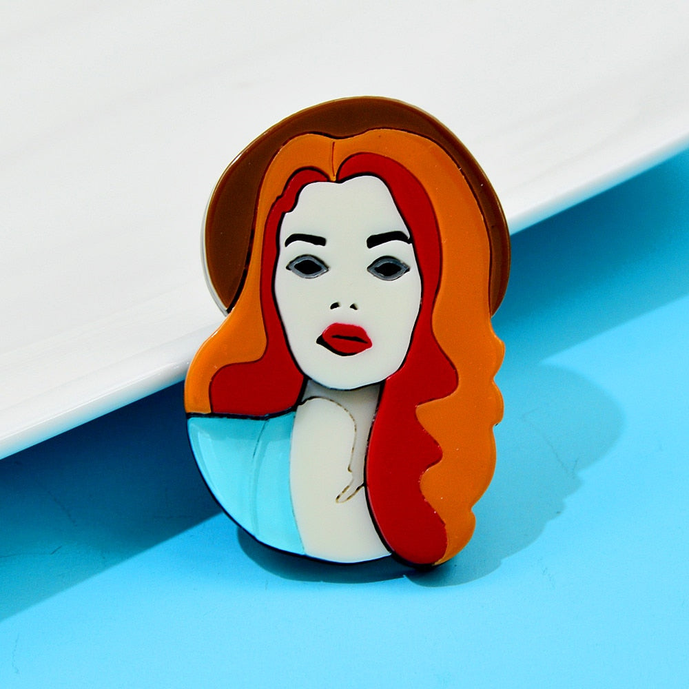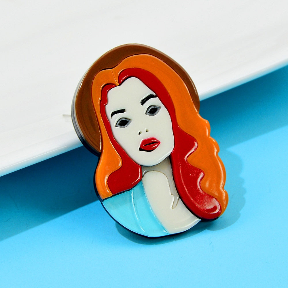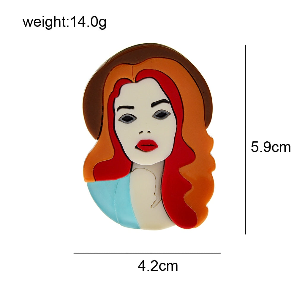 Brooches -Acrylic Beautiful Girl Portrait Brooch Red Hair Wear Hat Pin Aceteate Fiber Jewelry New Design