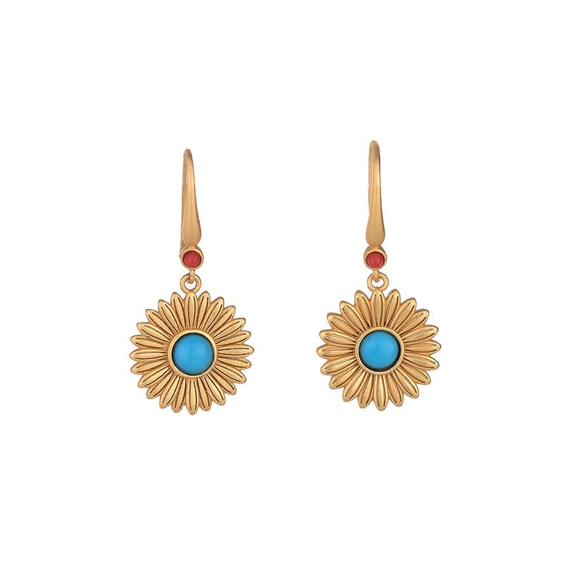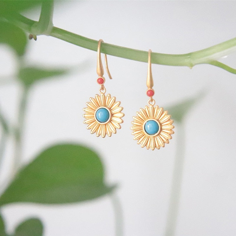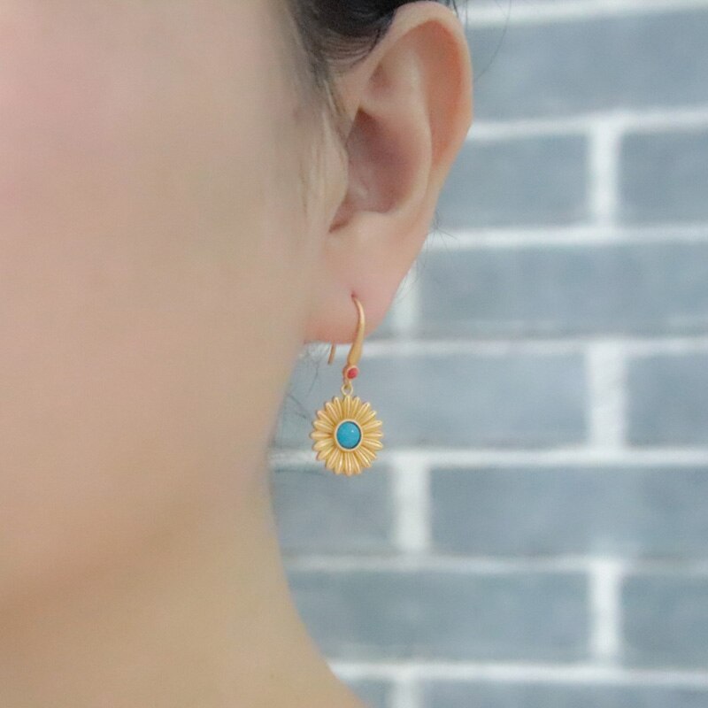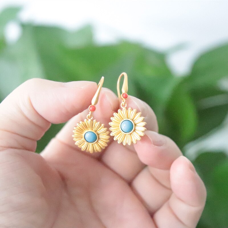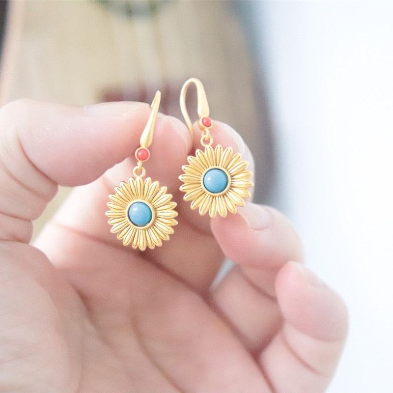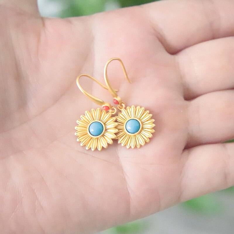 Drop Earrings-Ancient gold craft court style vintage inlaid turquoise earrings for women Hanfu jewelry round fresh Daisies eardrop