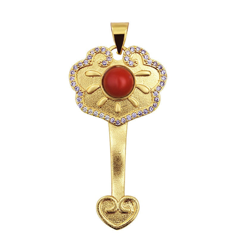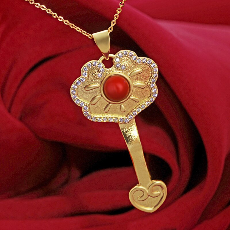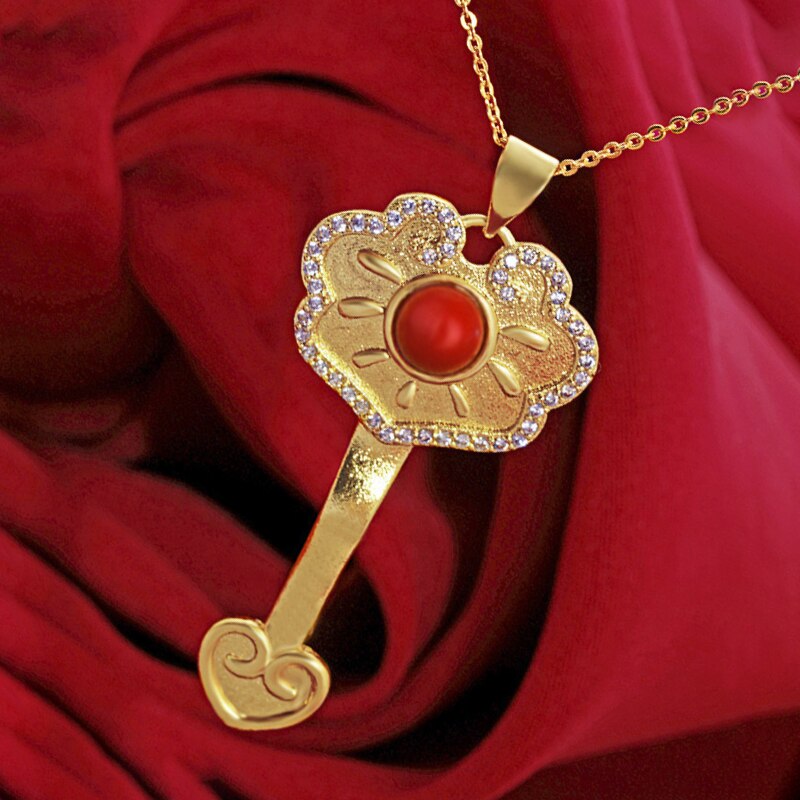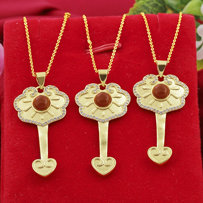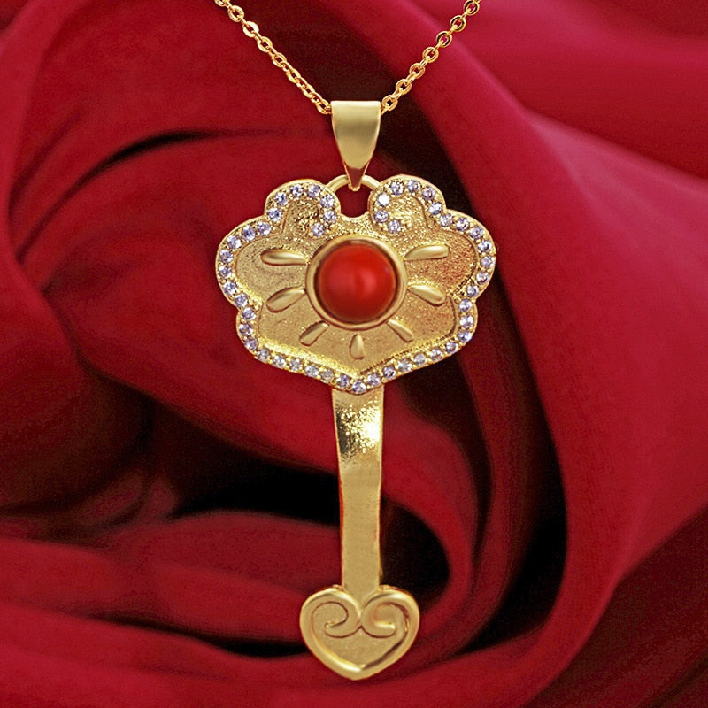 Chains Necklaces-Ancient Gold Craft Luxury ethnic style Ruyi Lock Necklace Inlaid South Red Tourmaline Pendant Wedding Engagement Jewelry